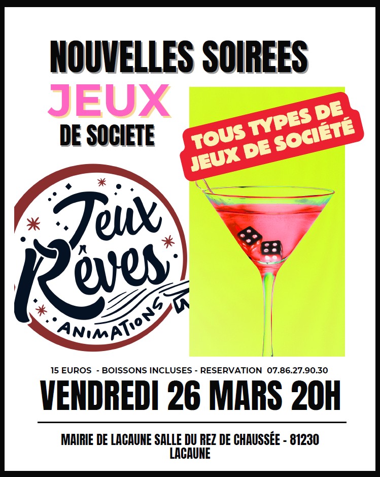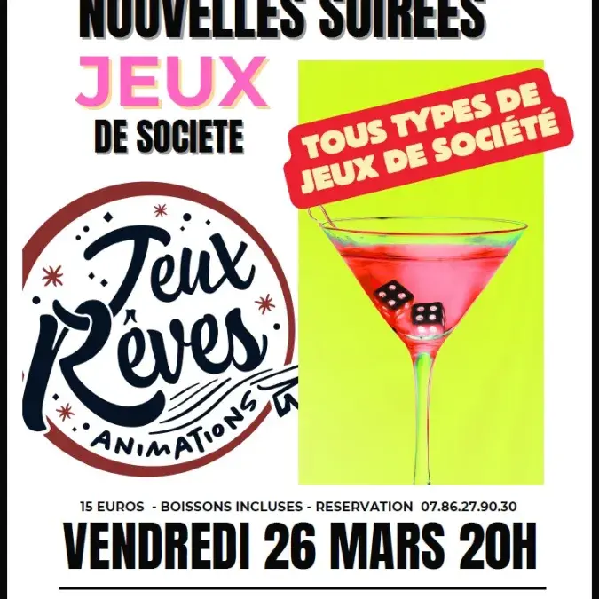 Soirée jeux de société pour ados et adultes : venez découvrir de nouveaux jeux dans une ambiance conviviale et détendue. 15 € la soirée, boissons incluses. Un moment de partage, de découverte et de bonne humeur autour du jeu.
