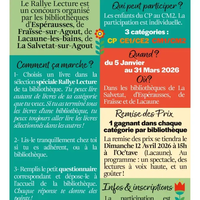 Le rallye lecture est un concours organisé par quatre bibliothèques du Territoire (La Salvetat, Fraïsse, Espérausses et Lacaune).