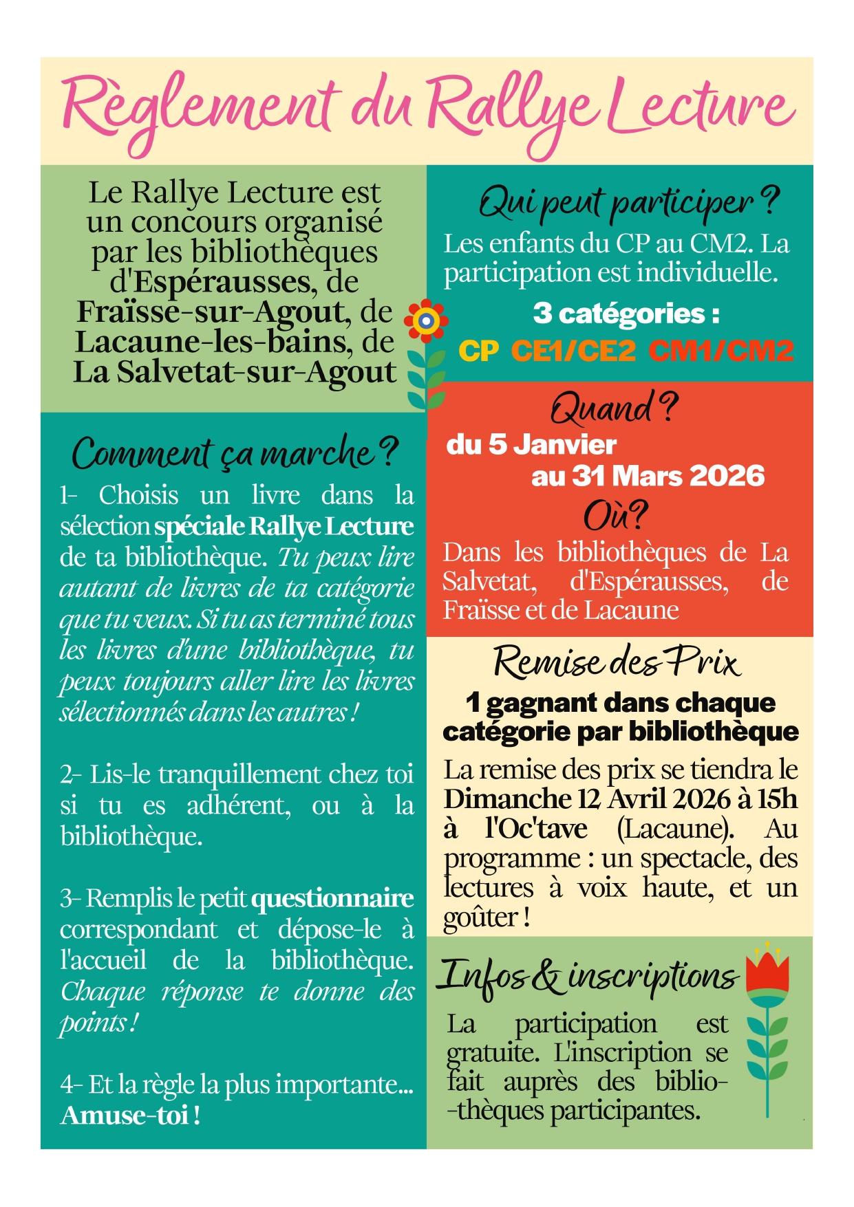 Règlement disponible dans toutes les bibliothèques participantes.