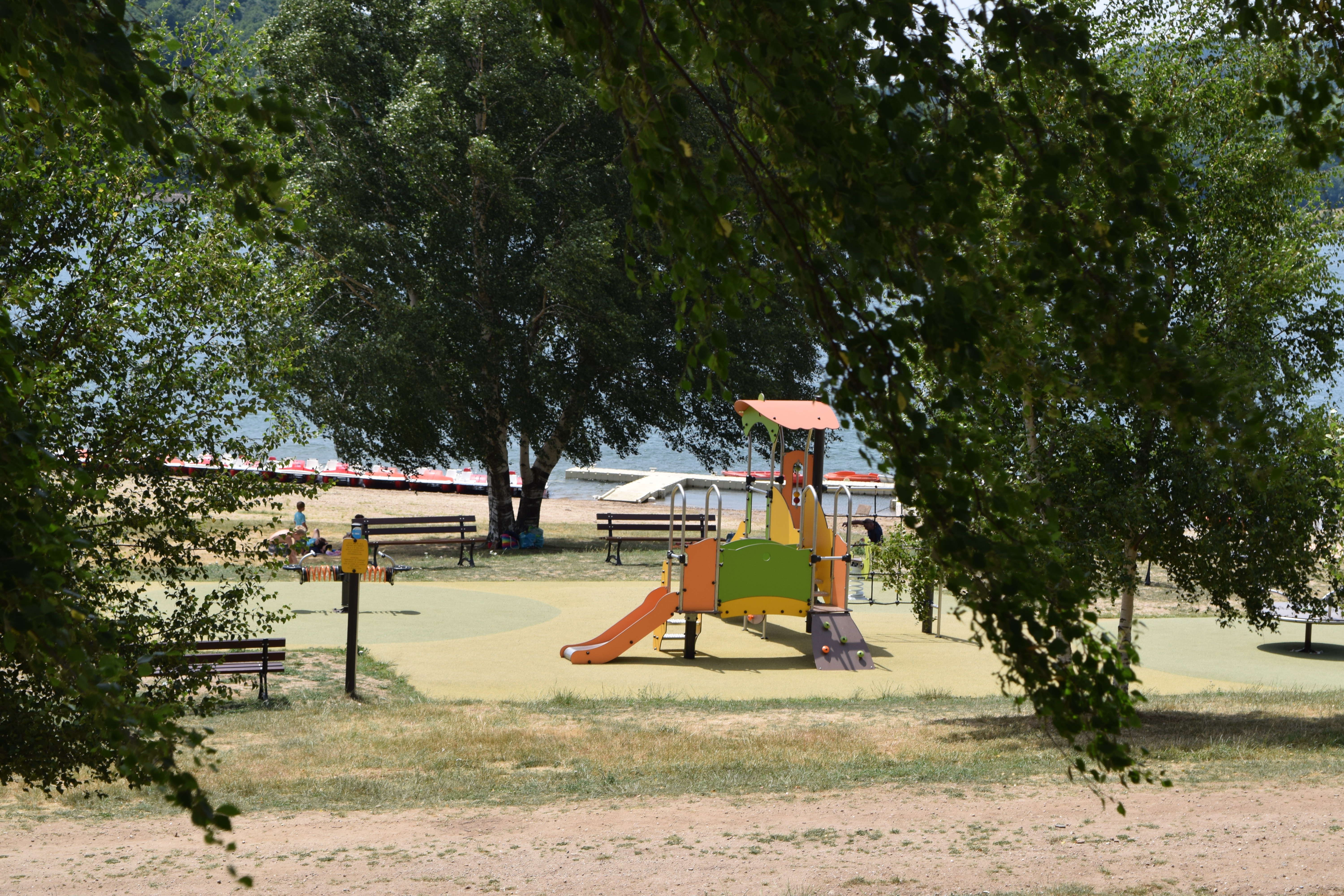 Face au lac du Laouzas, une grande aire de jeux attend les enfants : toboggan, araignée à grimper et petit mur d’escalade. Tout près de la piscine et des tables de pique-nique pour prolonger la journée.