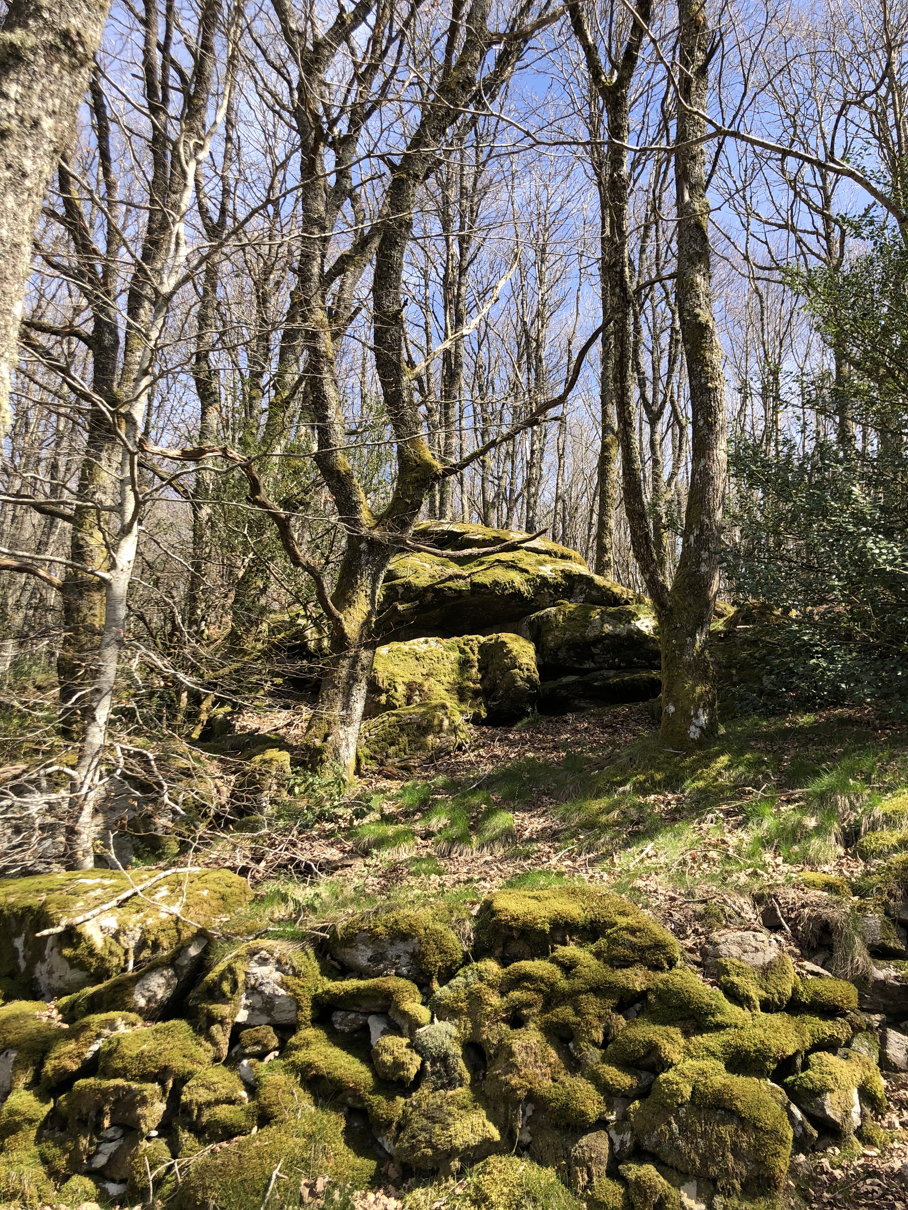 Chemin qui passe en forêt de feuillus et traverse un chaos de pierres. Cette étonnante et impressionnante avalanche de rochers au milieu des arbres, due à l’effritement géologique du roc, permet aux promeneurs grands ou petits bien des histoires imaginaires.
