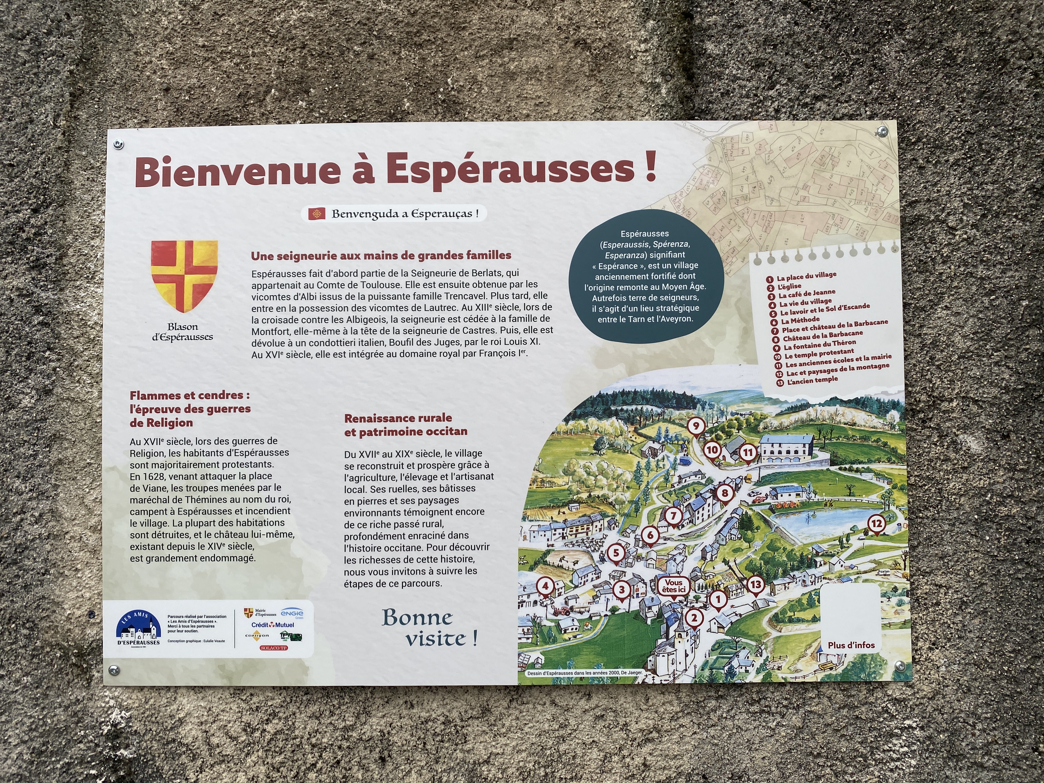Espérausses vous propose un voyage dans le temps et à travers la mémoire d'un territoire rural riche en histoire. Ce parcours patrimonial, accessible à tous et à réaliser en autonomie, vous invite à explorer 13 étapes emblématiques du village, retraçant son évolution depuis le Moyen Âge jusqu'à nos jours.