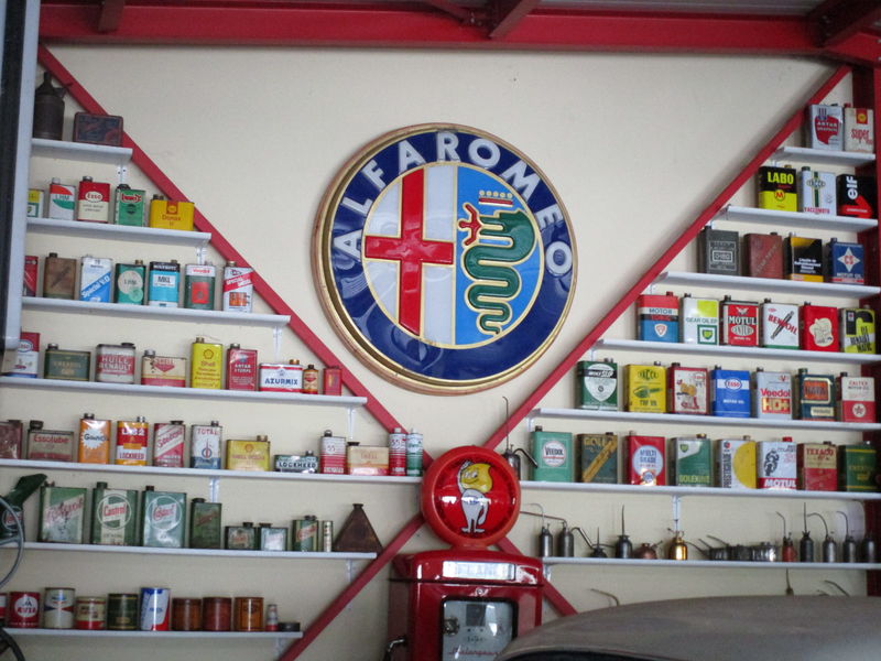 Des voitures et tout ce qu'il y a autour: collection de bidons d'huile, de plaques émaillées sur le thème de l'automobile, de vieilles pompes à essence,...