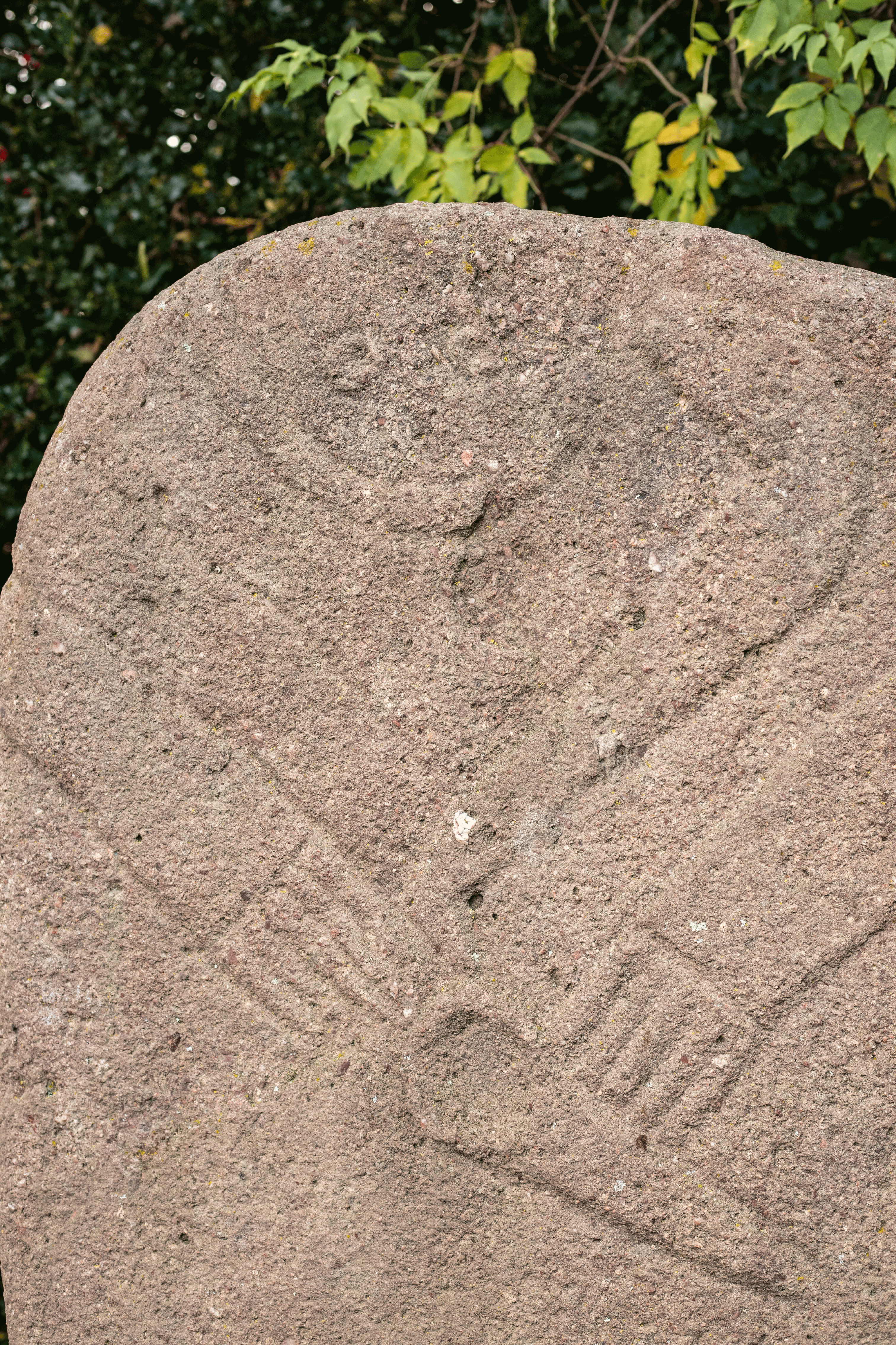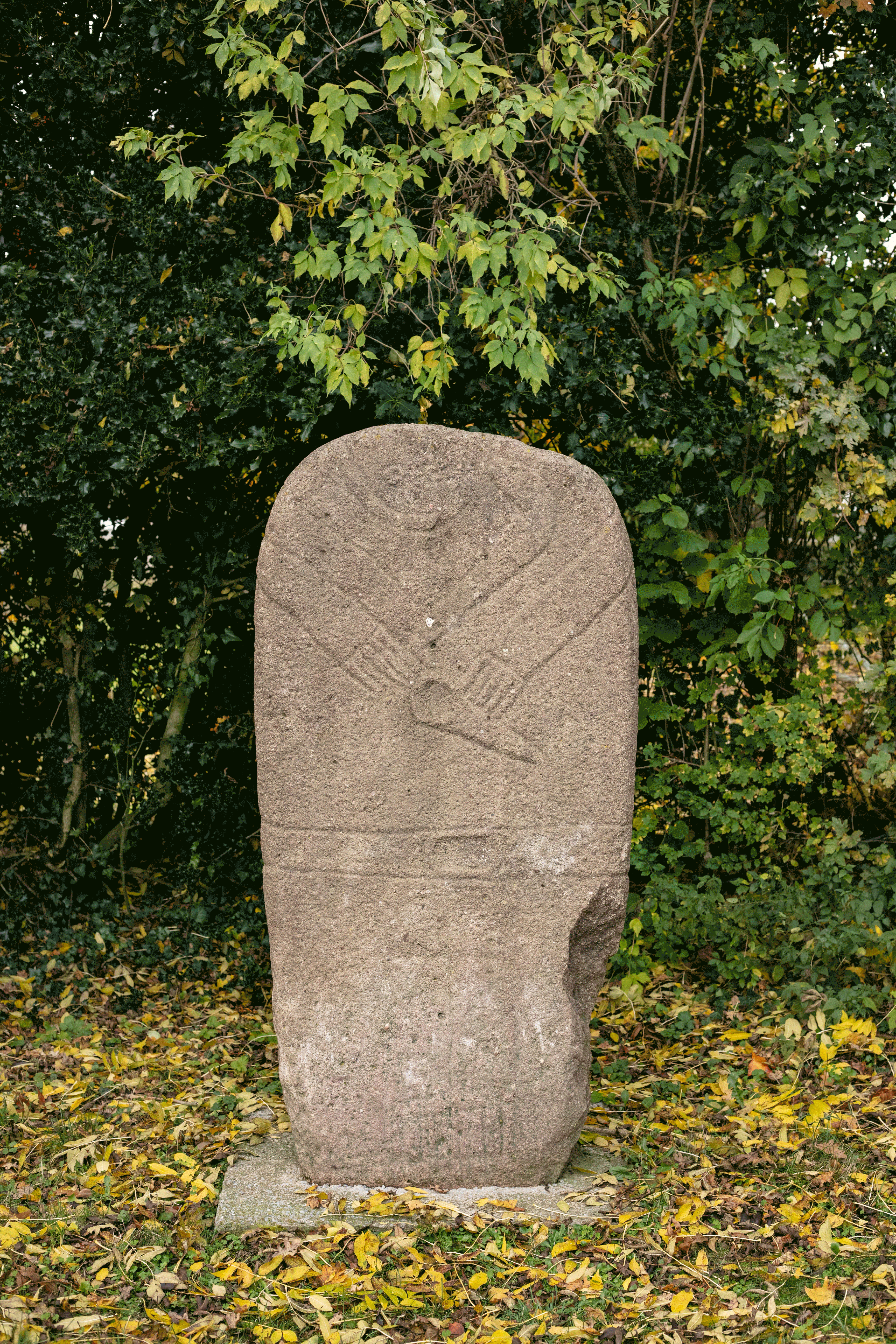 Ses gravures, d’une finesse remarquable, révèlent un visage stylisé légèrement décalé, un baudrier dont les bretelles se prolongent dans le dos, une ceinture décorée de chevrons avec plaque-boucle, ainsi qu’un pendeloque-poignard finement travaillé. Une hache, parfaitement identifiable (sans doute l’une des plus belles représentations connues dans la région) complète cet ensemble. Les jambes jointives se terminent par des pieds soigneusement détaillés, aux orteils allongés.