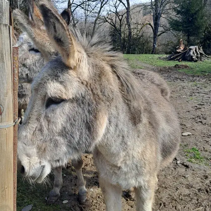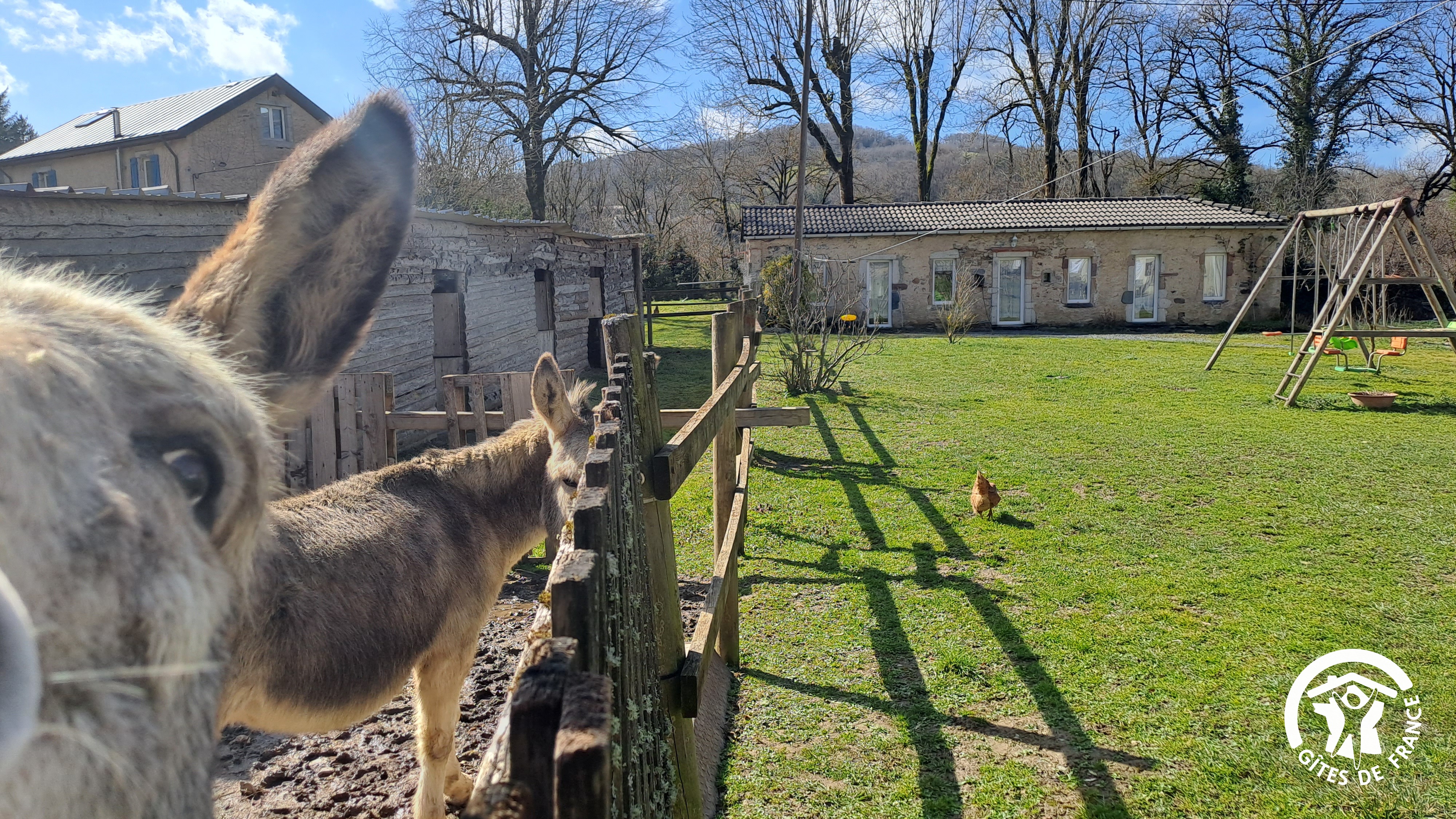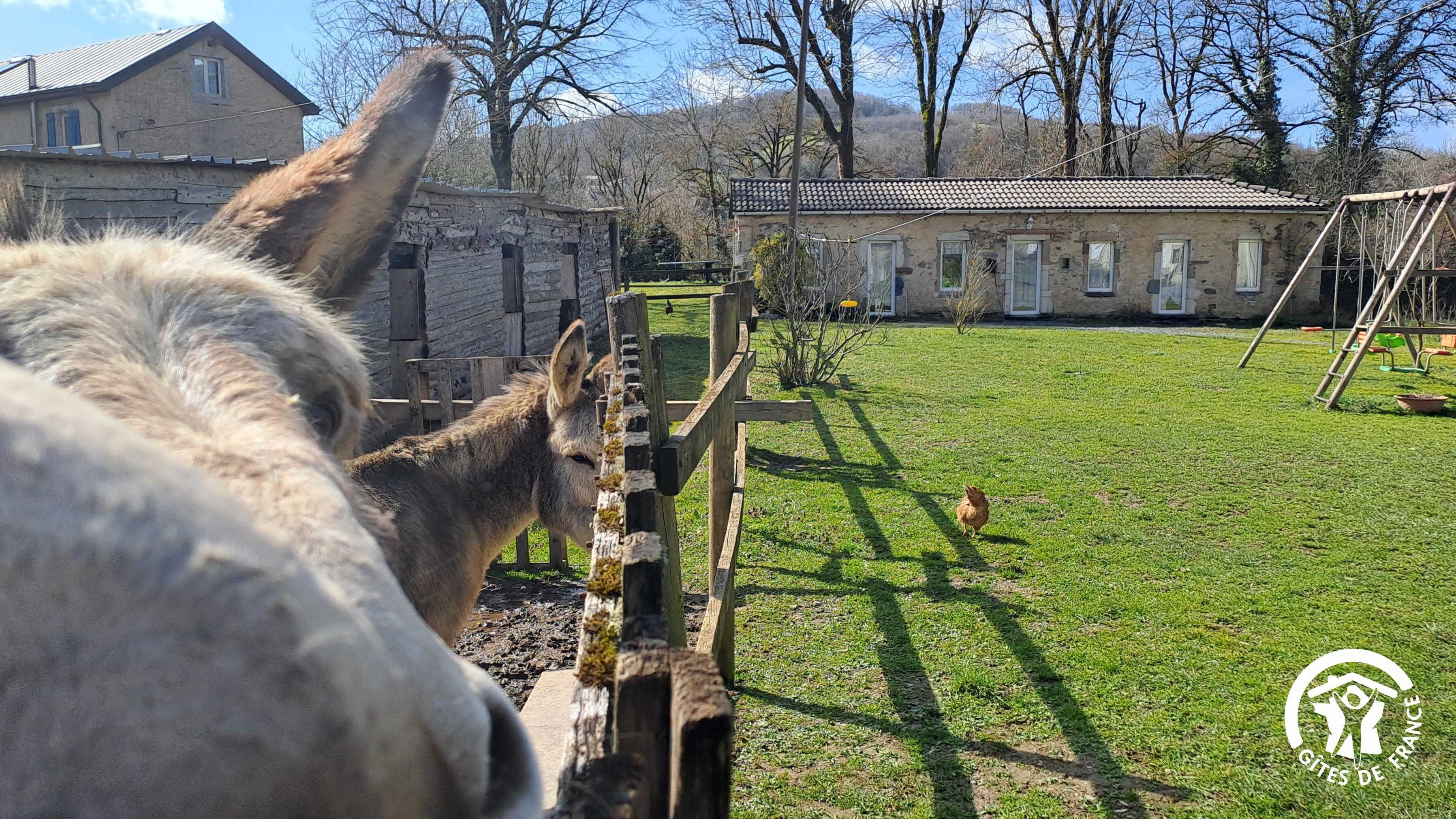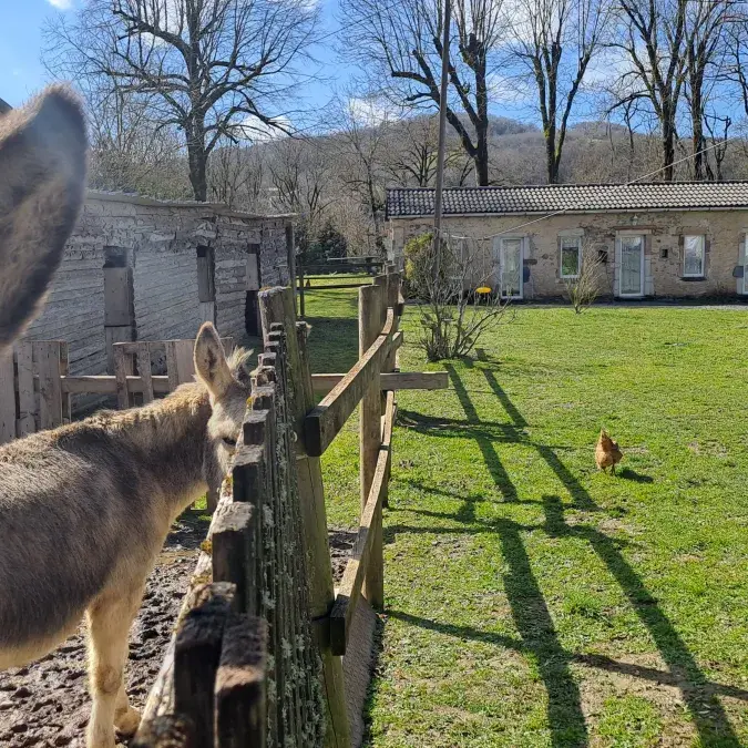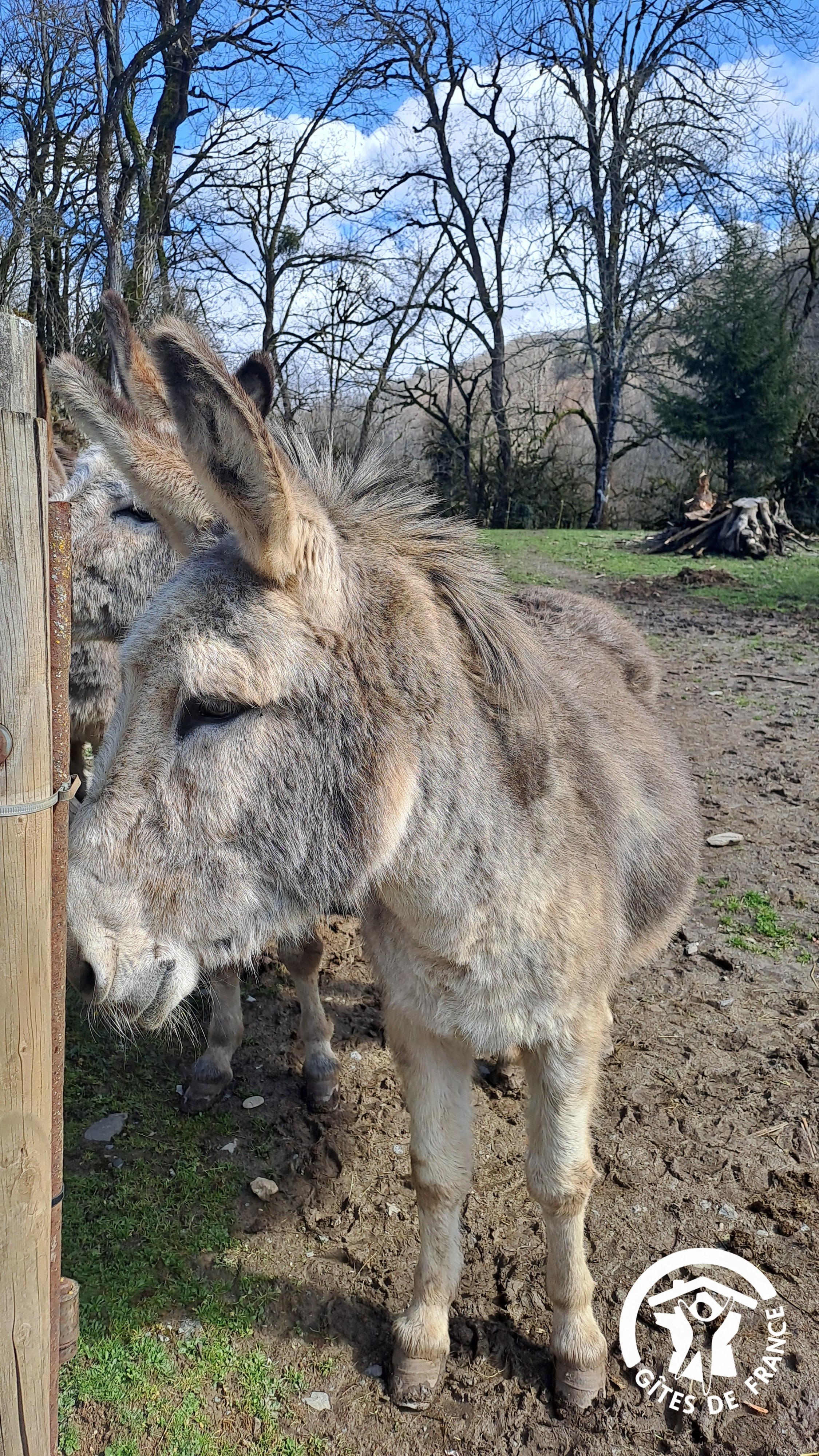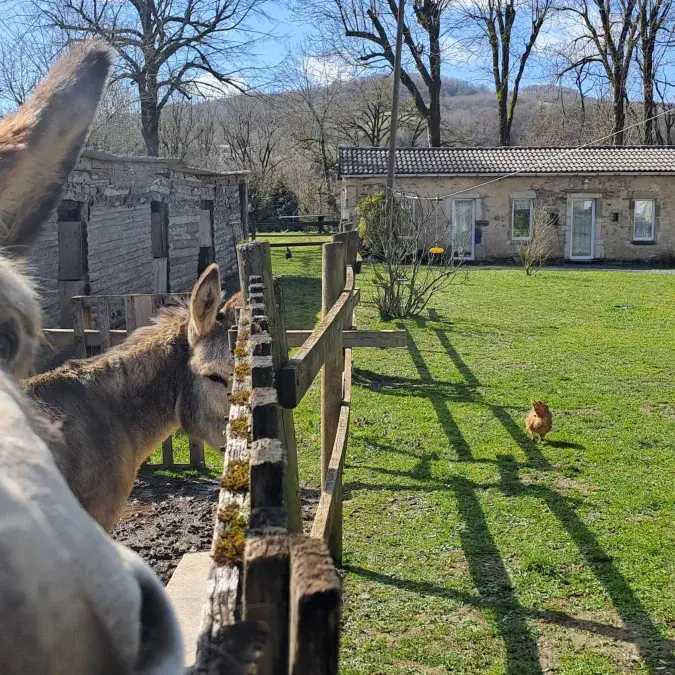 Parking is available right in front of the gîte. Shared courtyard with the owners, plus two hens, one cat and of course Charly, Oli and Lili — the three donkeys who love being petted!