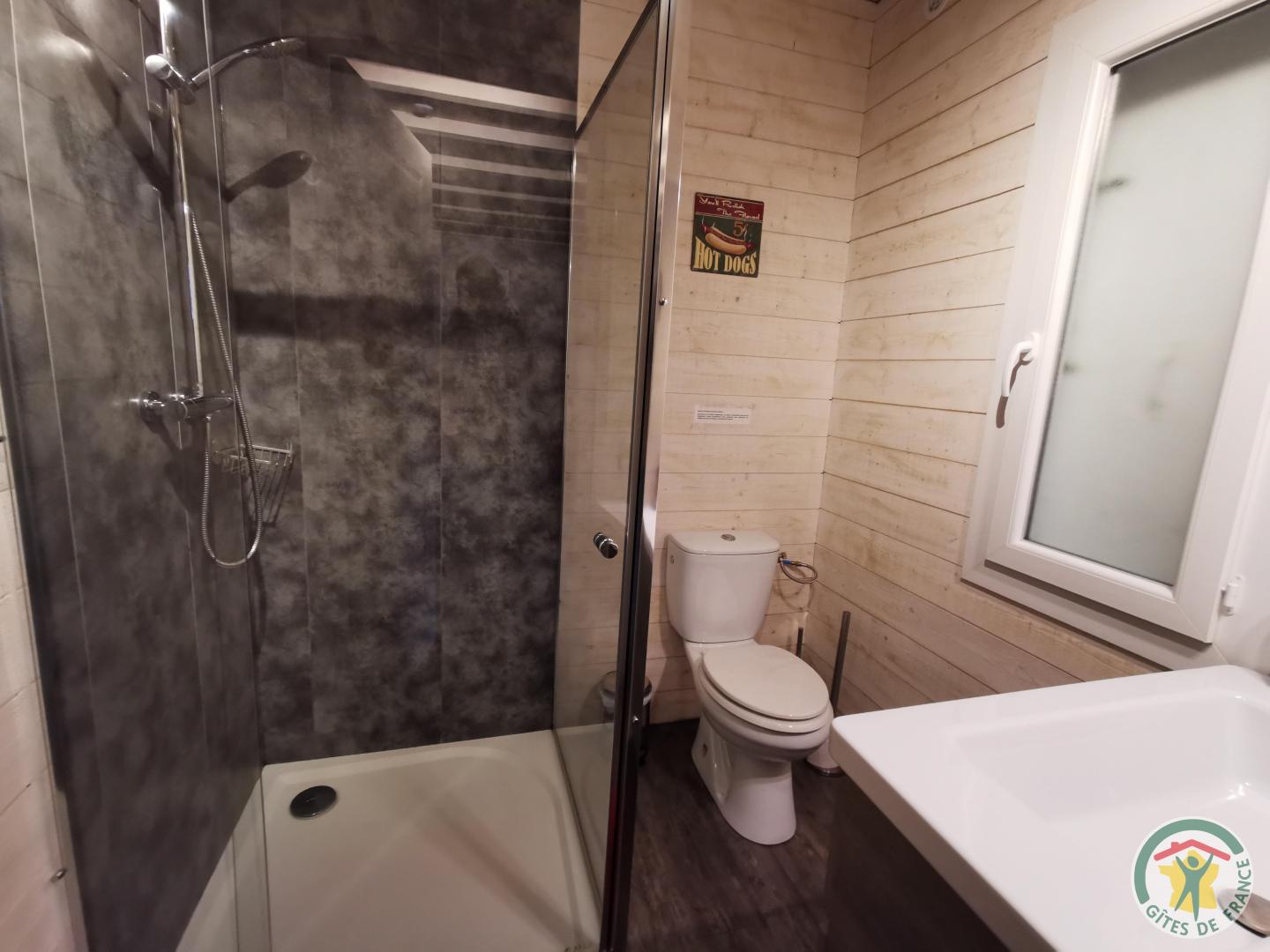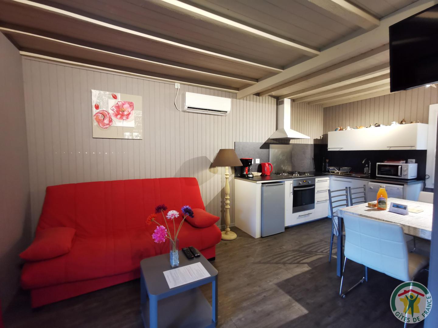 The living room includes an equipped kitchen and a sofa bed. It leads to a shower room with toilet and to a comfortable bedroom with romantic décor (140x190 bed).