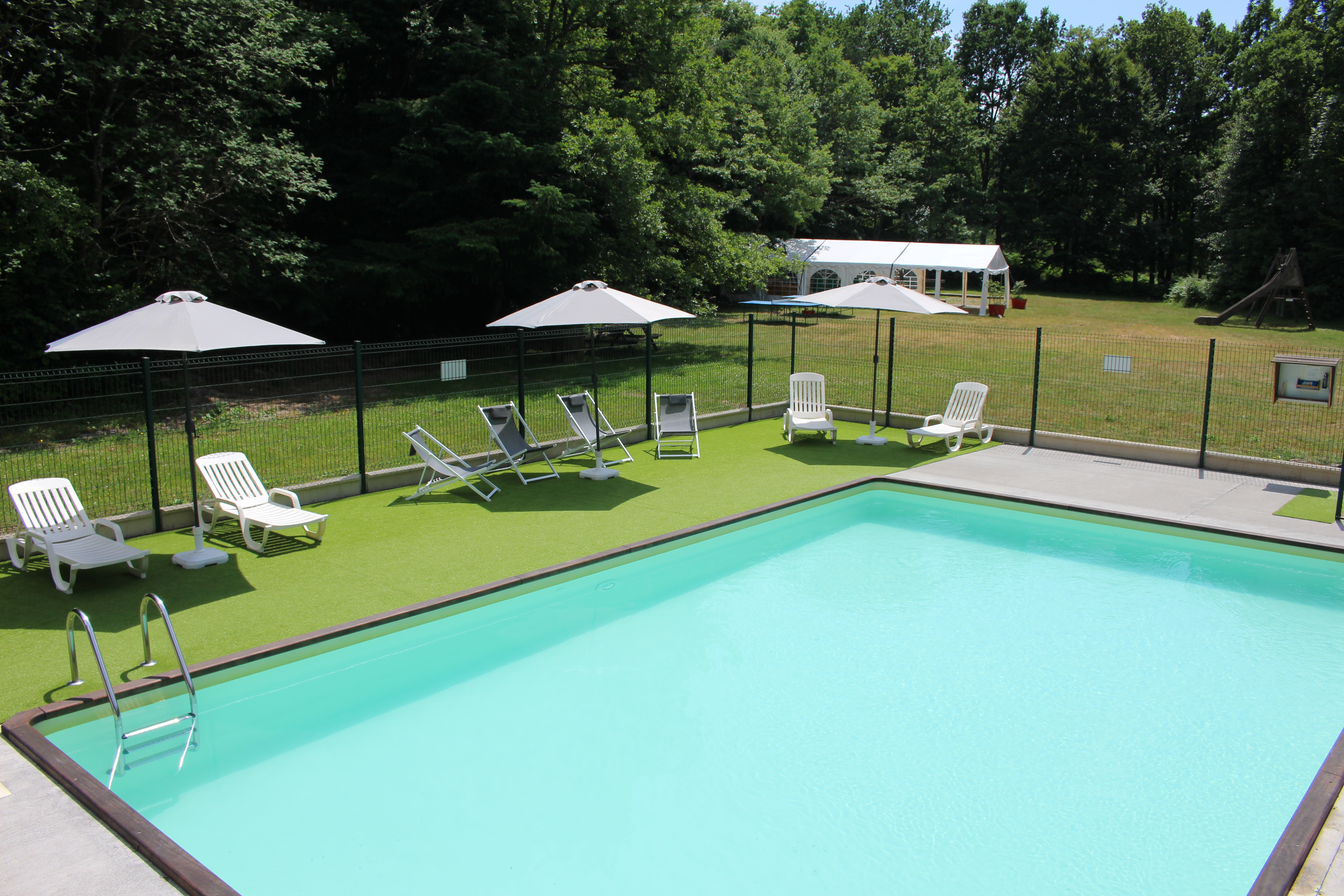 On the 5-hectare estate, you can enjoy free access to a pool area, a playground with swings, slide, pétanque court and table tennis. A discovery trail is on site, and 3 donkeys are waiting to accompany you on your walks. All gîtes have a private outdoor space with a terrace overlooking the forest.