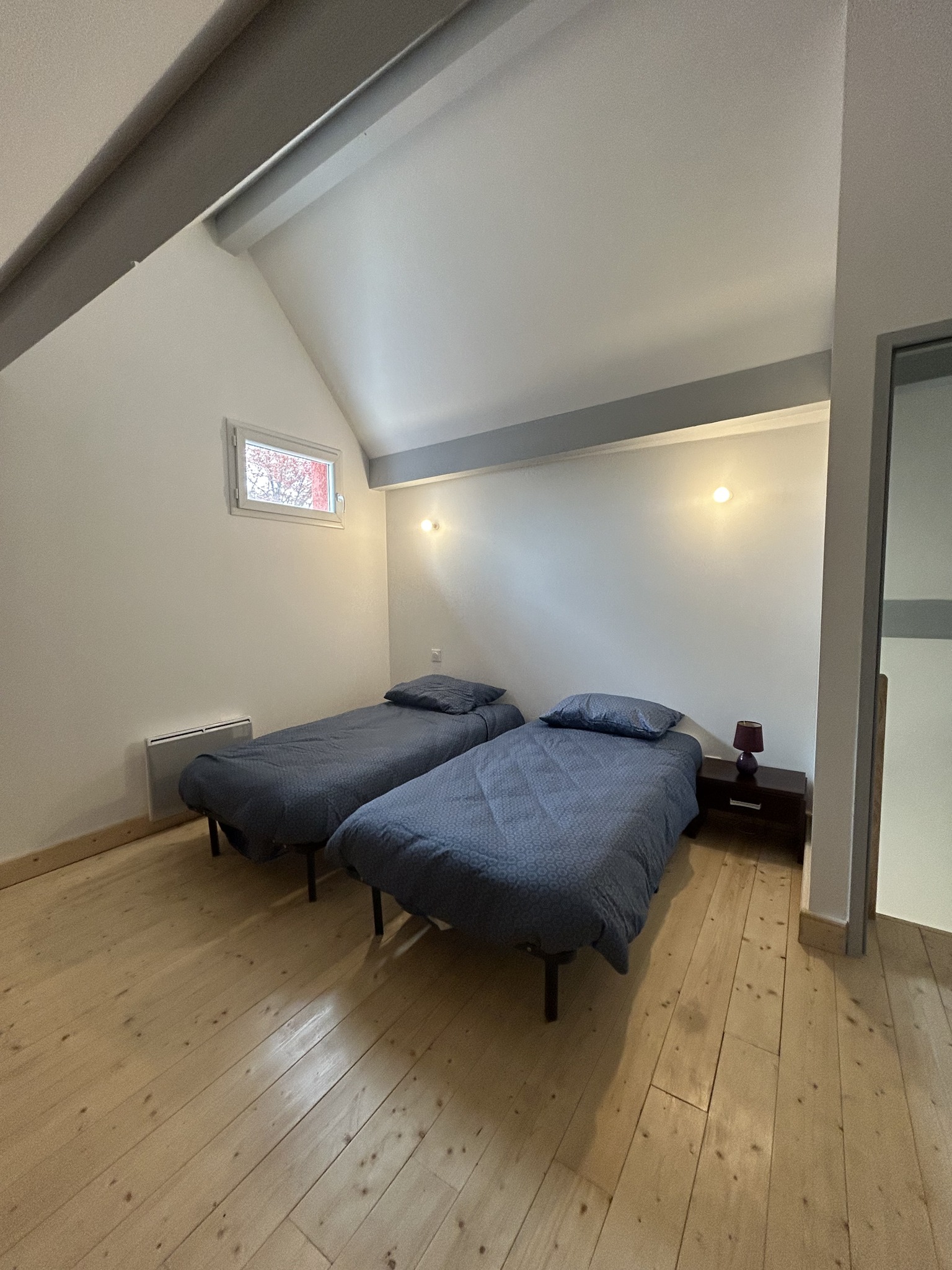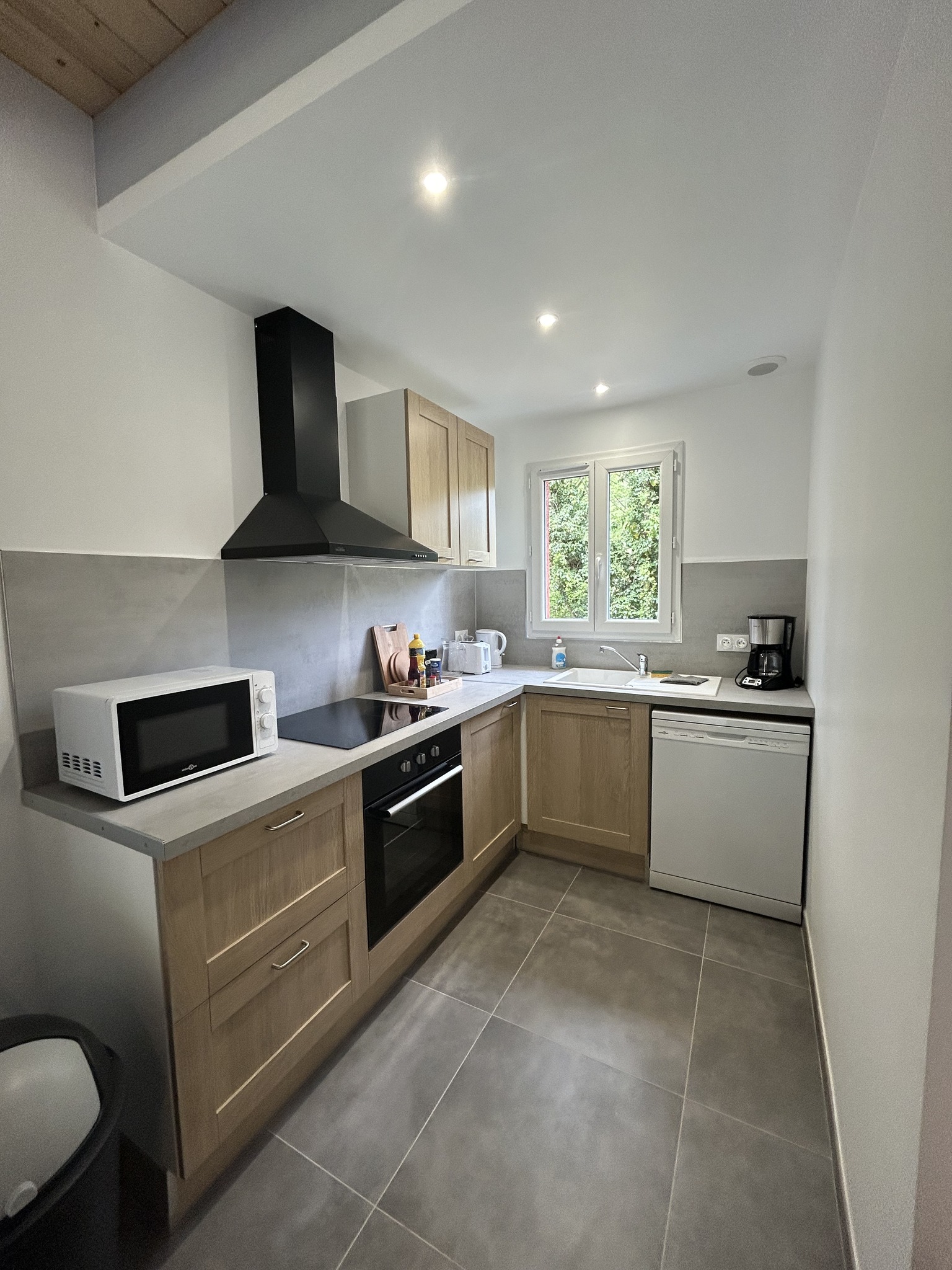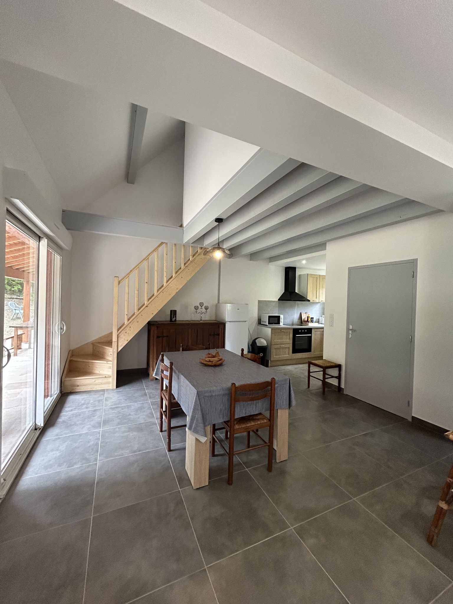 Holiday house in La Salvetat-sur-Agout, 60 m²: living/dining room, fully equipped kitchen, 2 bedrooms, shower room with toilet. Sleeps up to 6 people. Open all year – electric heating.