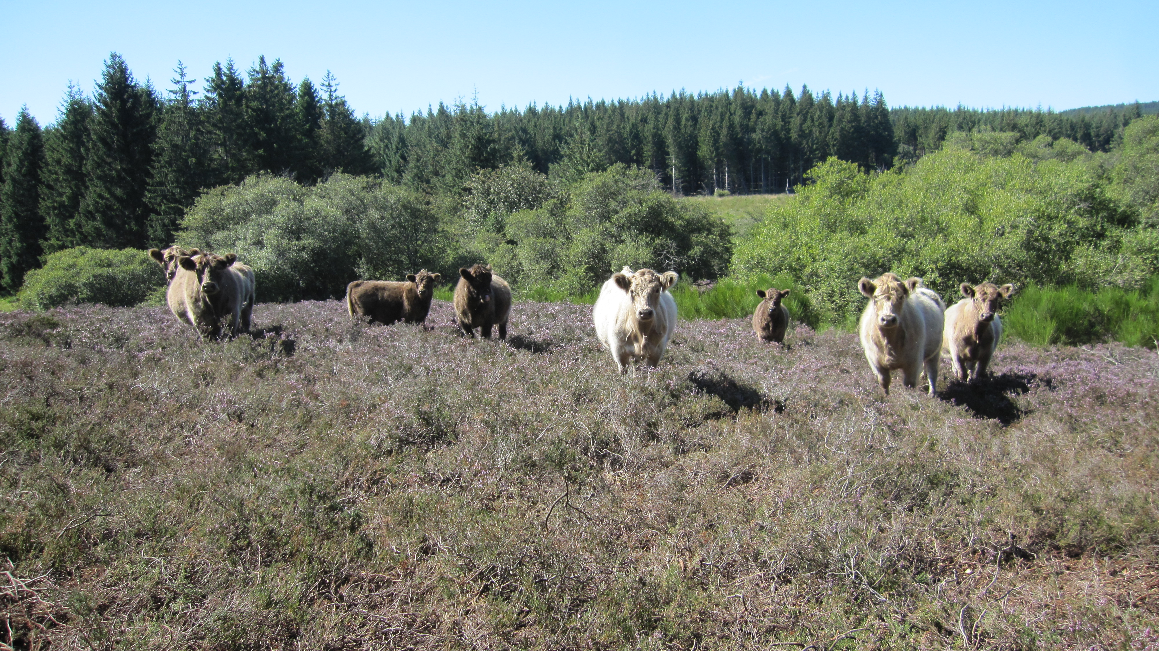Practicamos ganadería extensiva, respetuosa con el animal y la naturaleza. Nuestras vacas viven en el exterior todo el año, en rebaños, con el toro siempre presente. Se desplazan por amplias zonas de pastoreo formadas por praderas, brezales y turberas. La diversidad vegetal es muy importante, y las vacas pastan según sus necesidades.