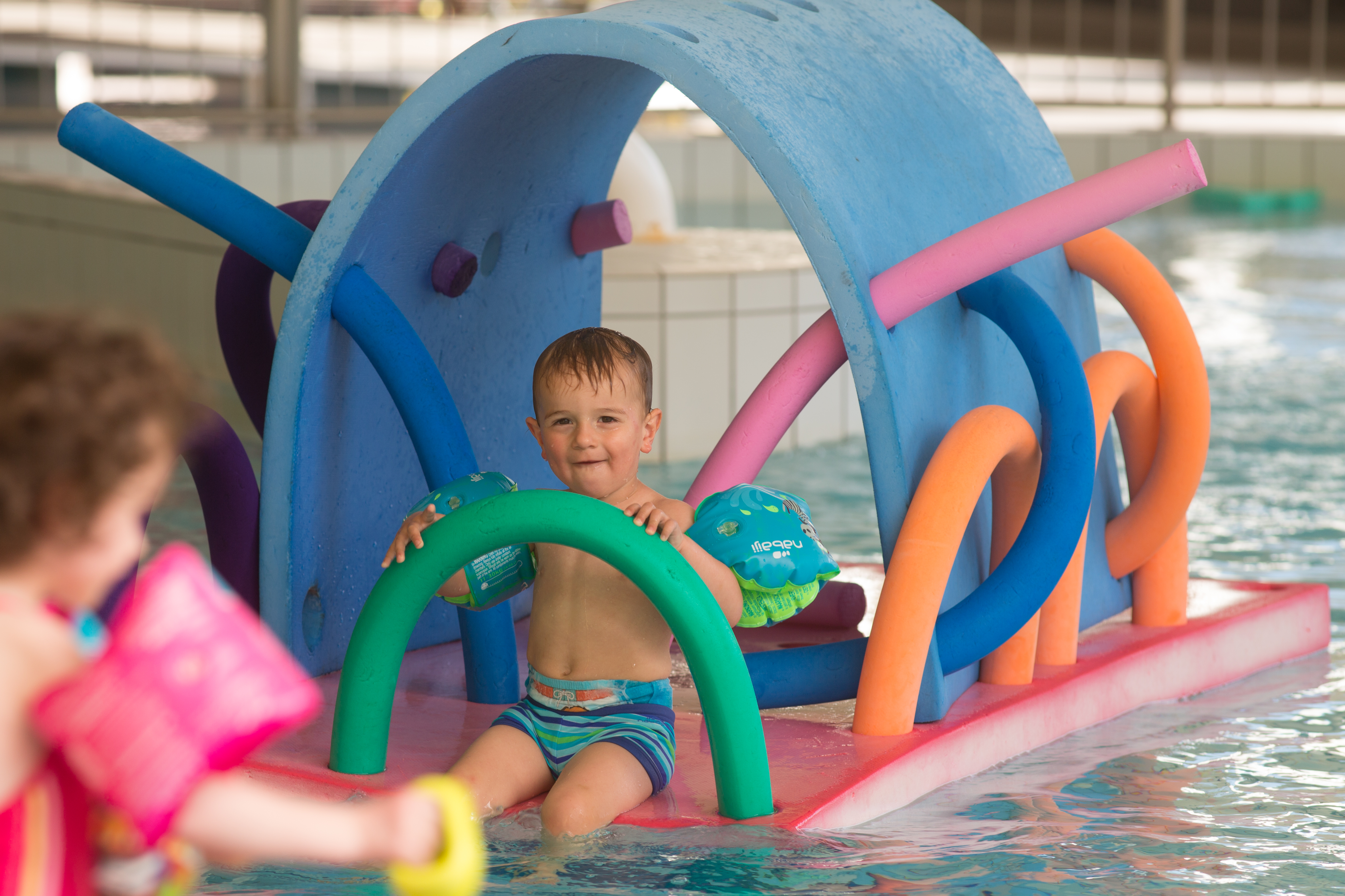 En agua especialmente calentada a 32°C para los más pequeños, el niño aprende jugando y se desarrolla a su propio ritmo, probando experiencias sin peligro porque papá o mamá está presente.
