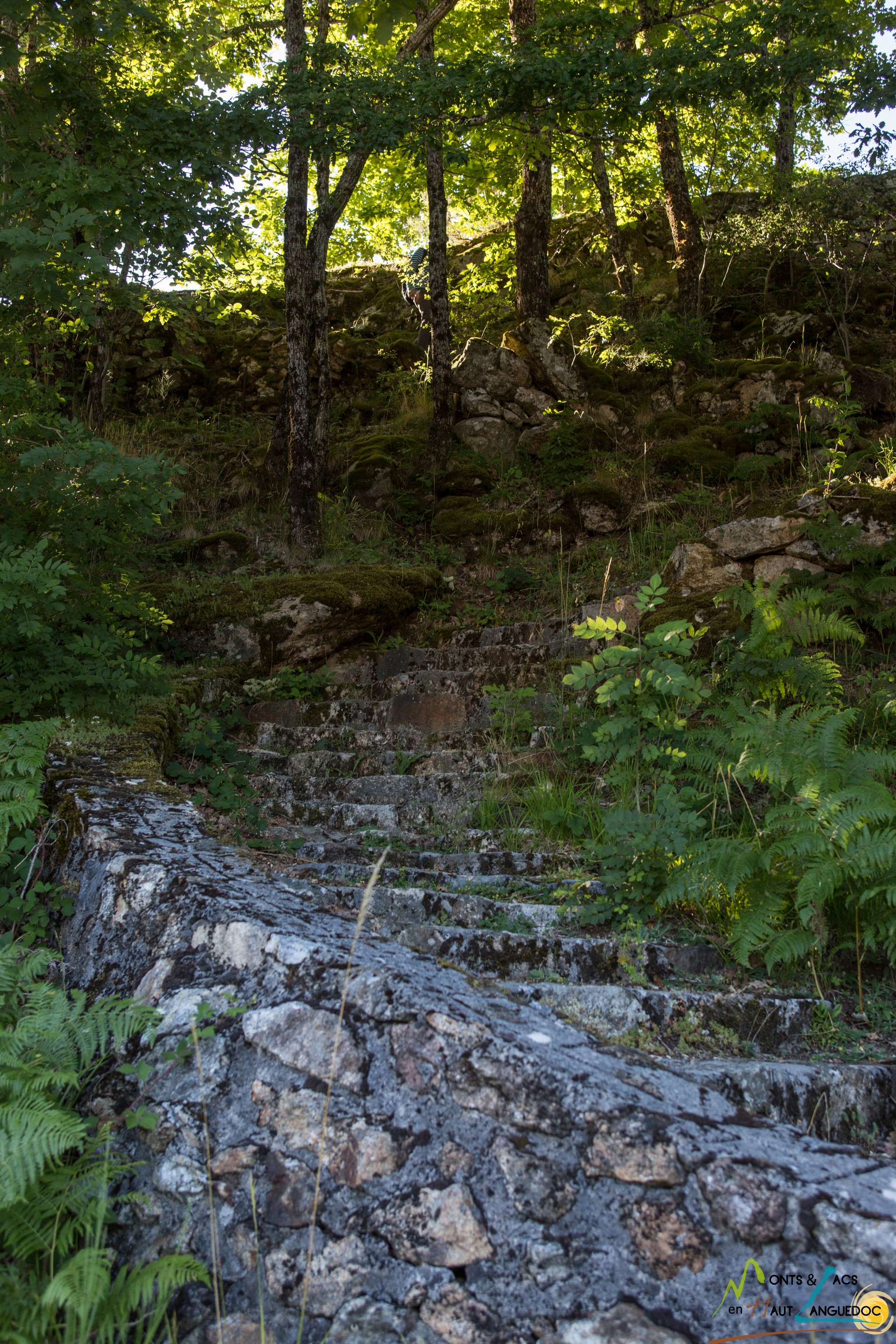 En faire le tour qui domine le plan d’eau. Prendre à droite le sentier qui plonge vers l’eau, franchir la passerelle sur le ruisseau de la Capte et remonter le bord de la route jusqu’au grand mur du barrage du Laouzas (50 mètres de haut). Traverser le barrage.