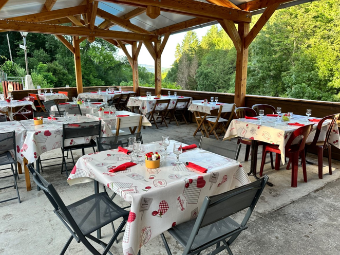 En el exterior, una terraza sombreada frente a las colinas boscosas; en el interior, un ambiente rústico con manteles a cuadros y chimenea… L’Auberge de la Resse es un lugar para todas las estaciones.