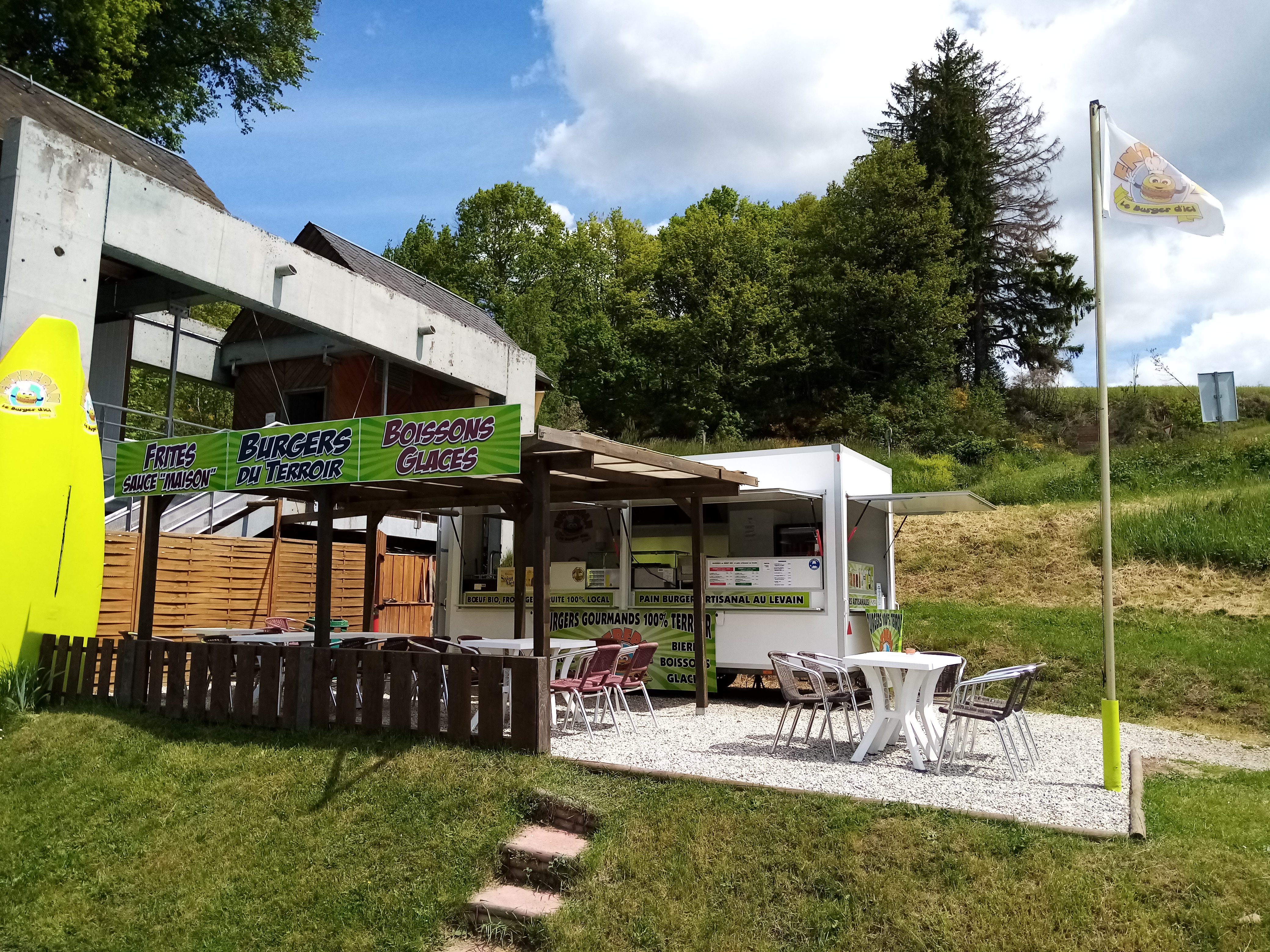 A orillas del lago de La Raviège, casi con los pies en el agua, Xavier ofrece deliciosas hamburguesas del terruño elaboradas con carne de vacuno ecológica y charcutería de Fraïsse, pan artesano de masa madre de Saint-Pons, cerveza local y helados FLIPO.