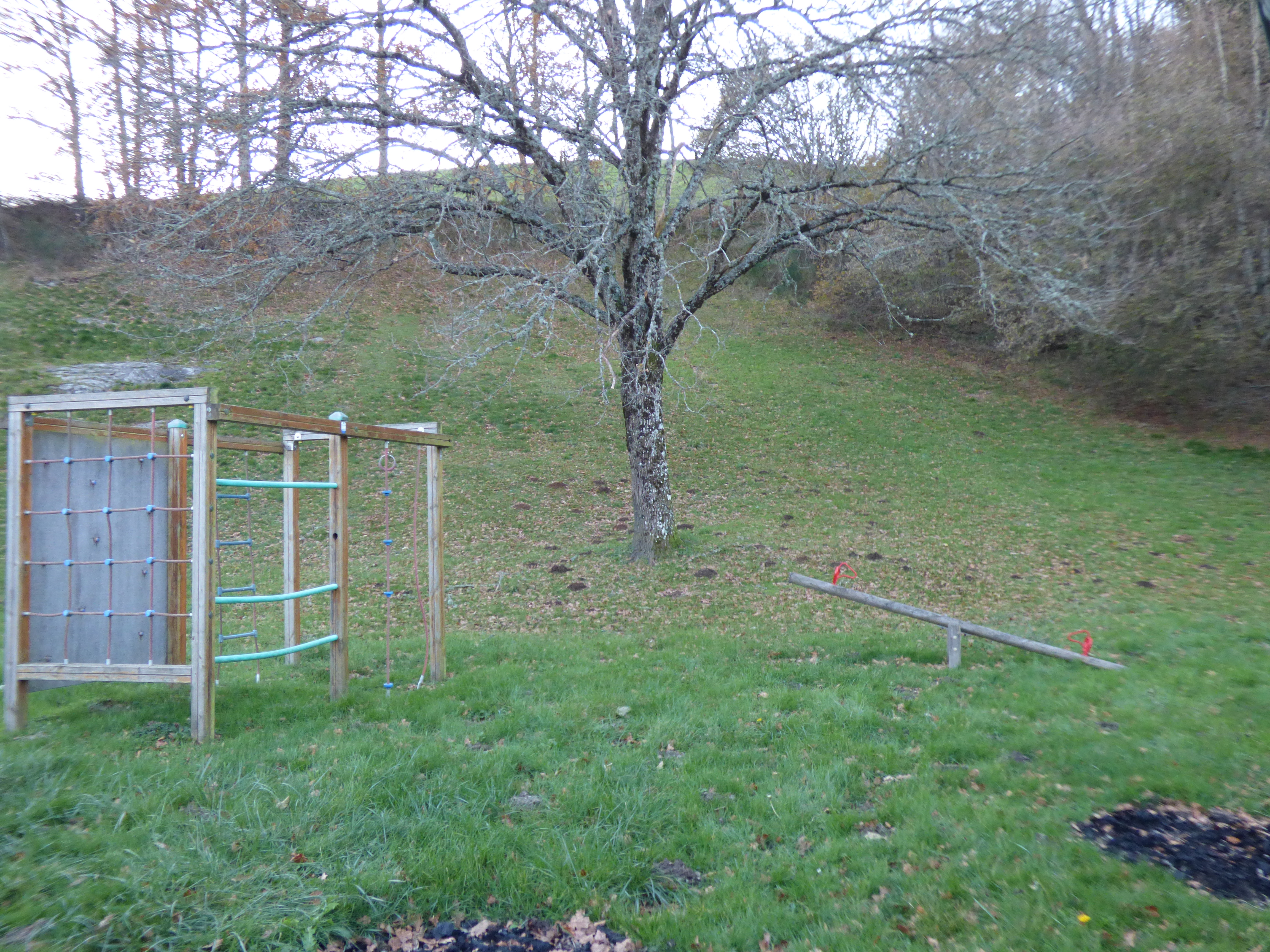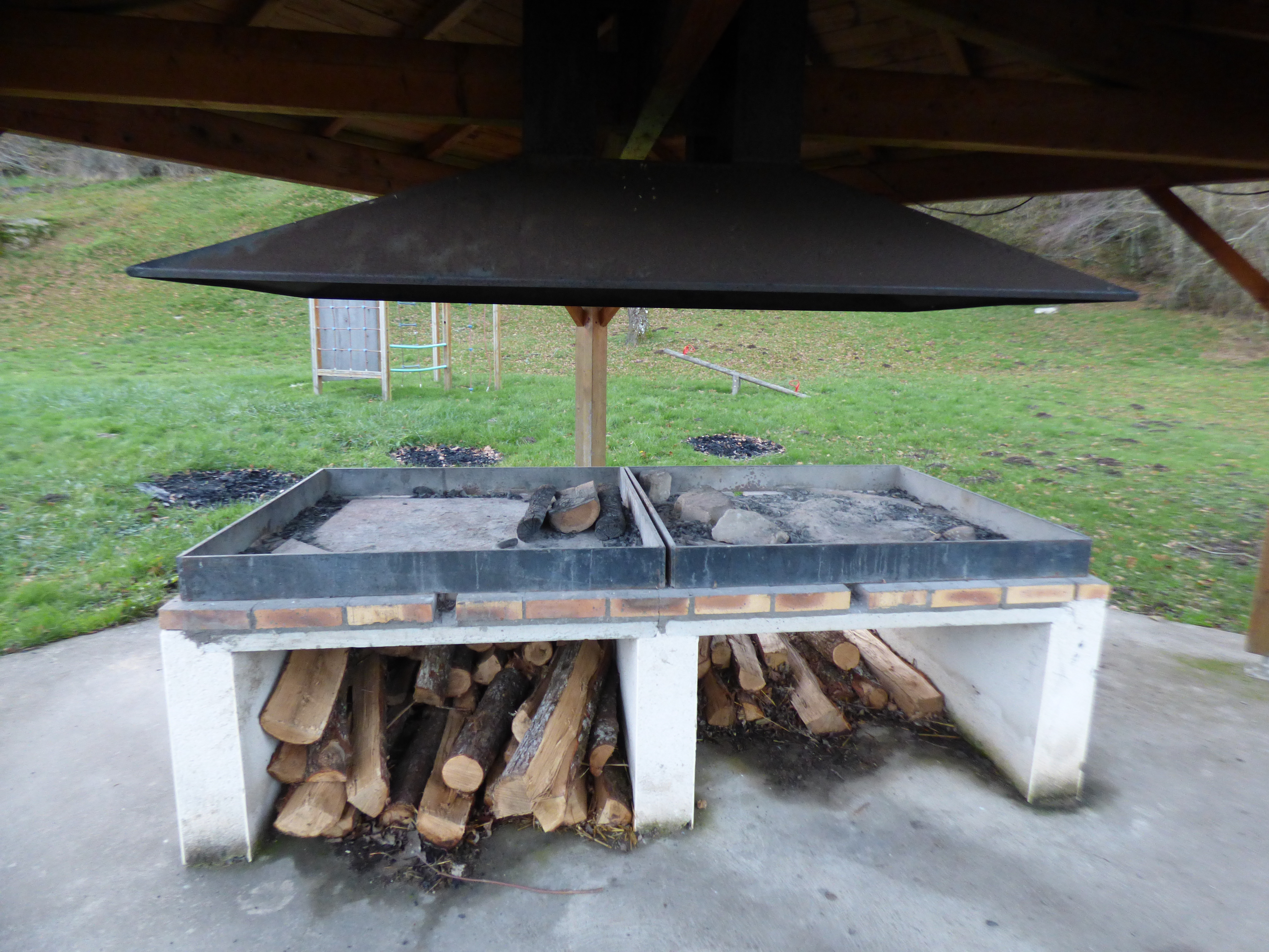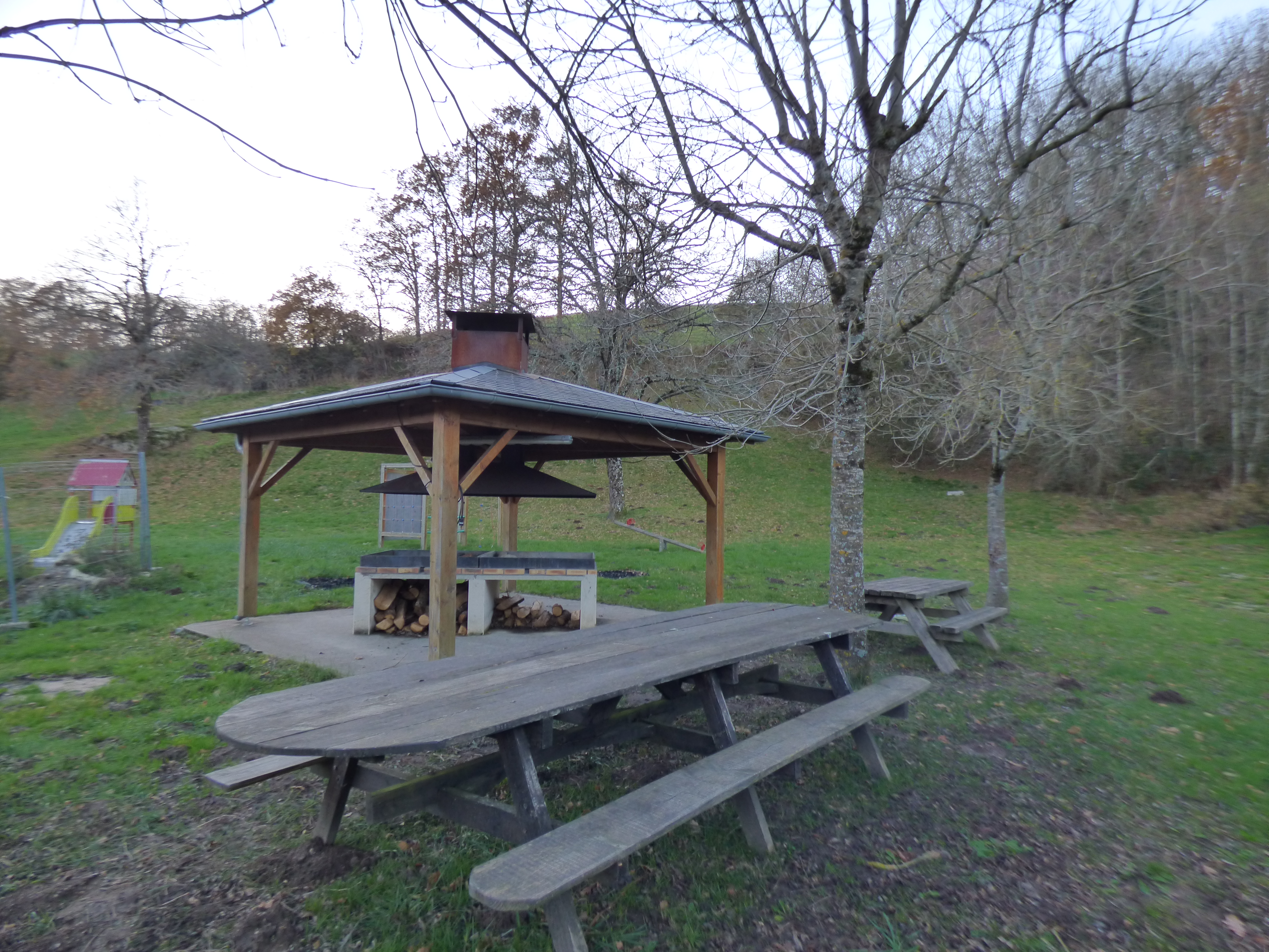 Área equipada con dos barbacoas, zona de juegos infantiles y aparcamiento cercano. Punto de recarga para coches eléctricos y acceso al río al otro lado de la carretera.