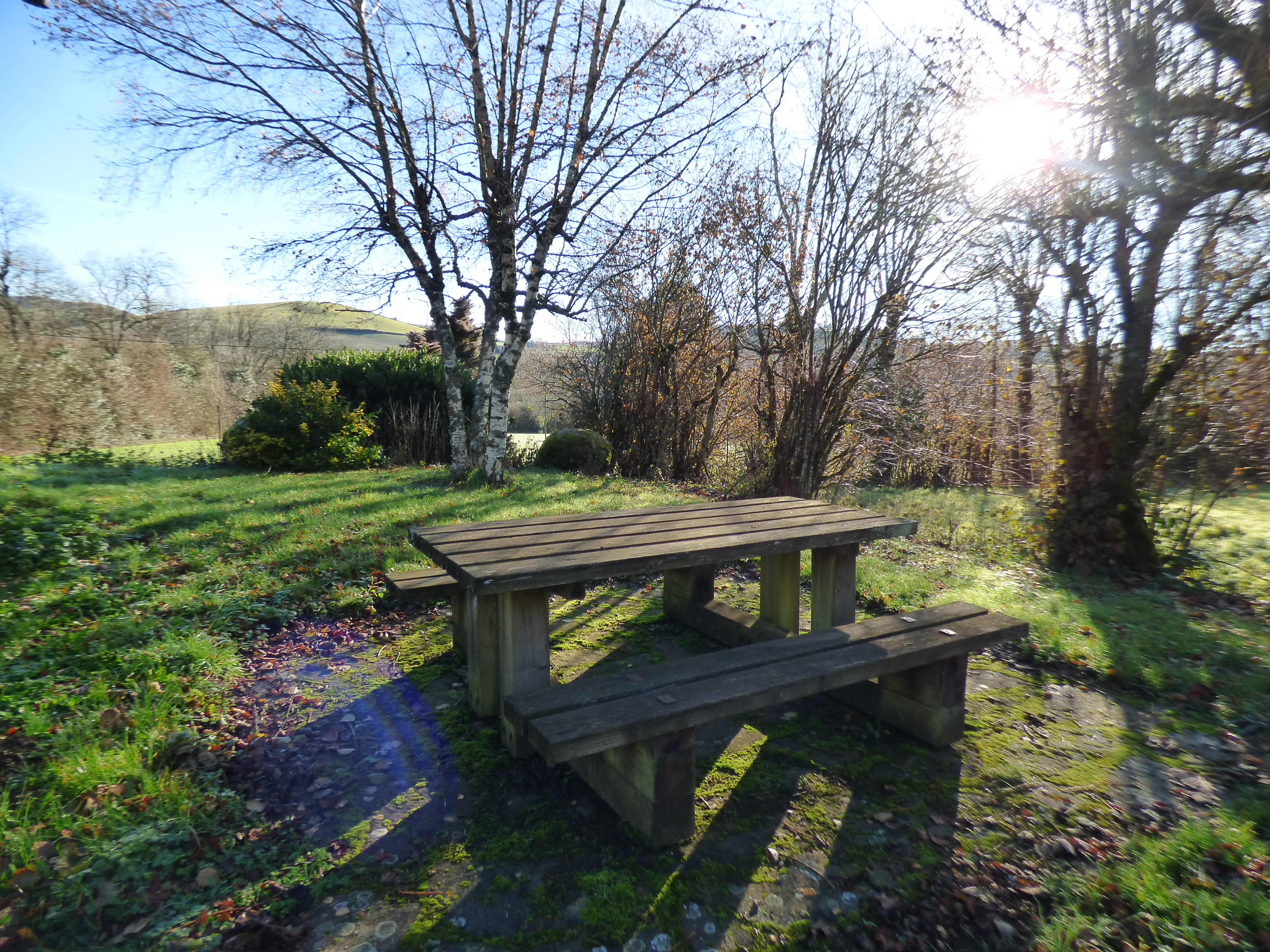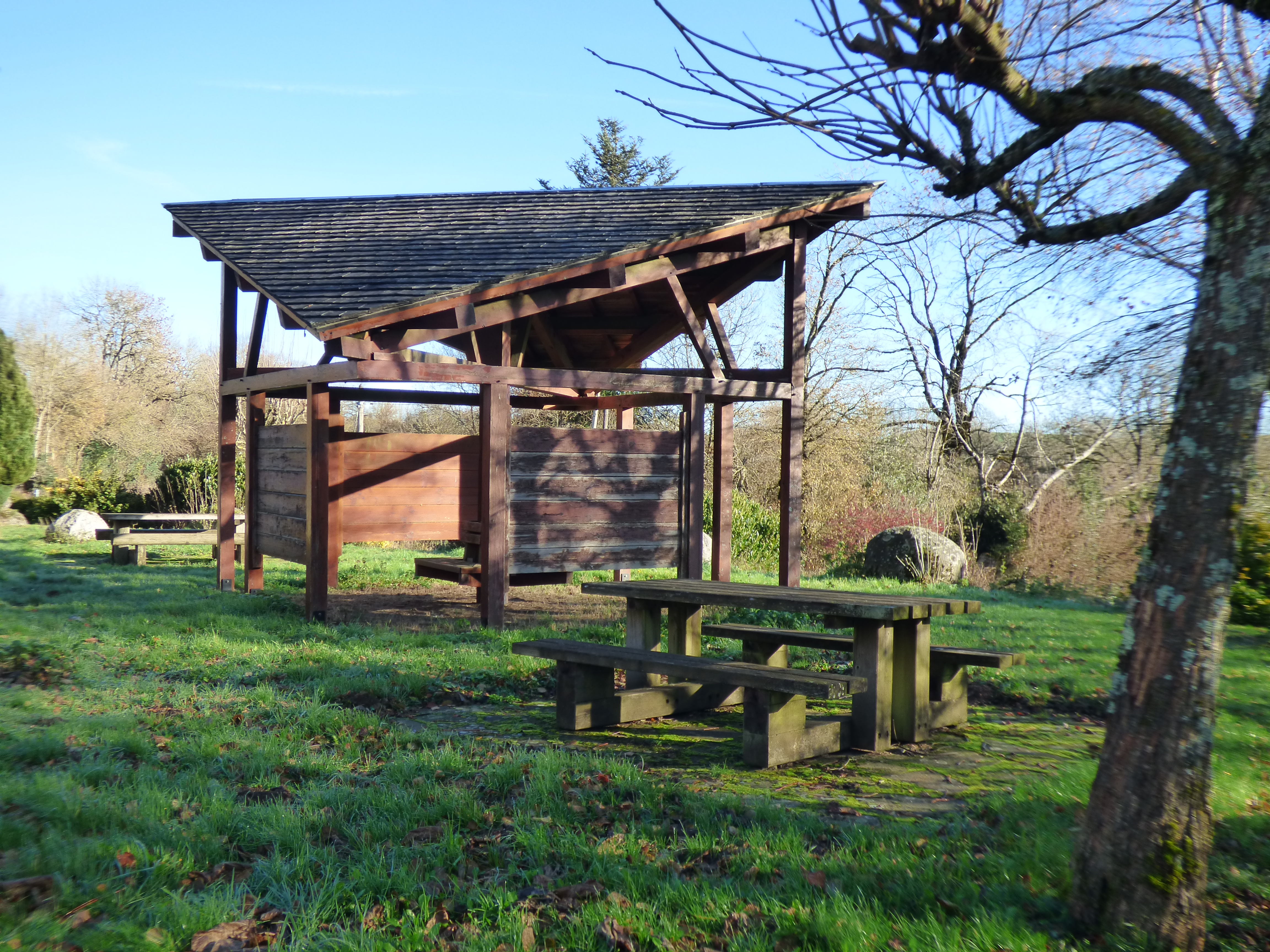 Área junto a la carretera, equipada con dos mesas, un cobertizo con bancos y zona de estacionamiento.