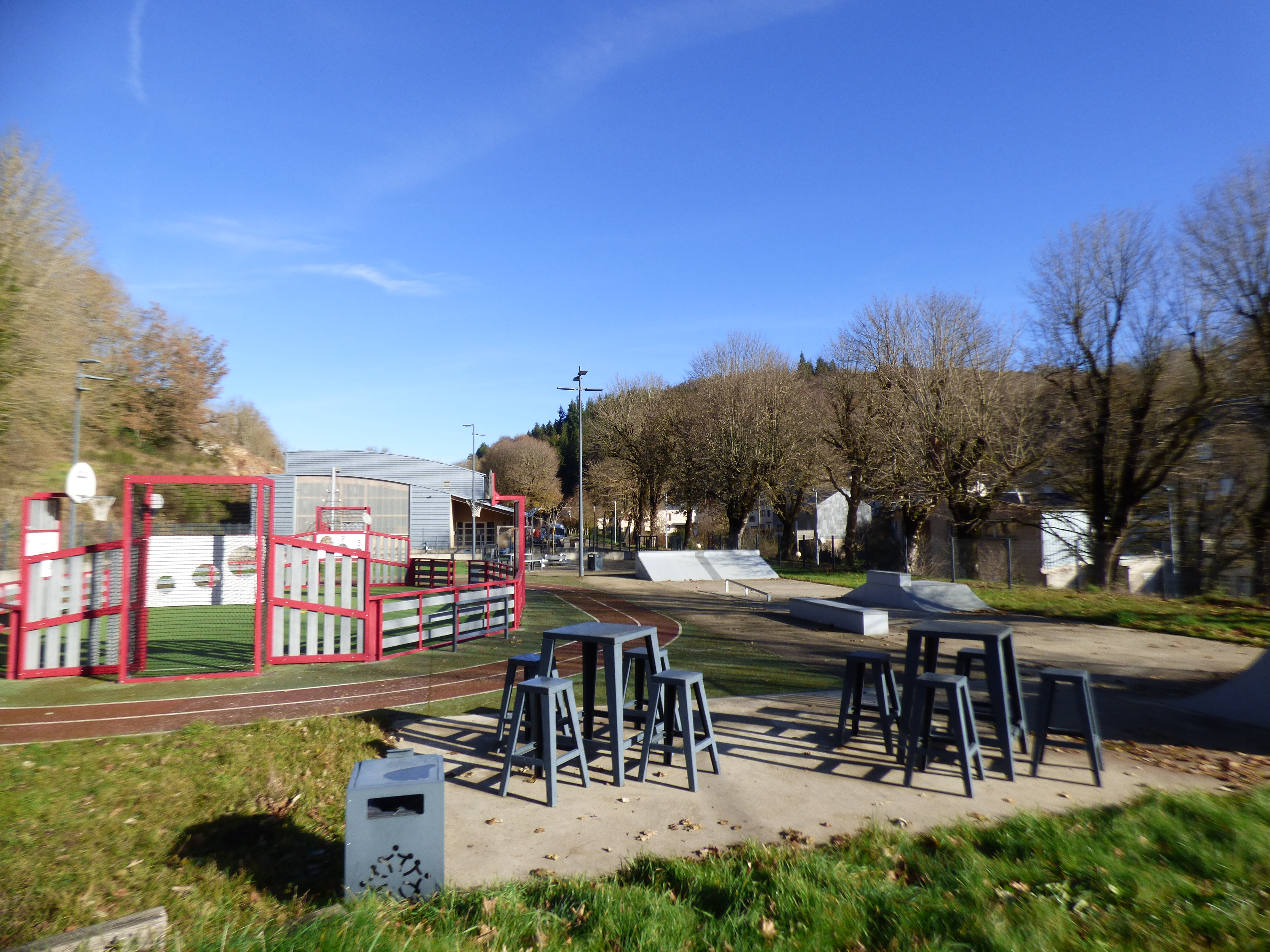 Agradable área de picnic situada dentro de una zona de juegos, con aparatos de ejercicio, pequeña pista de atletismo y skatepark.