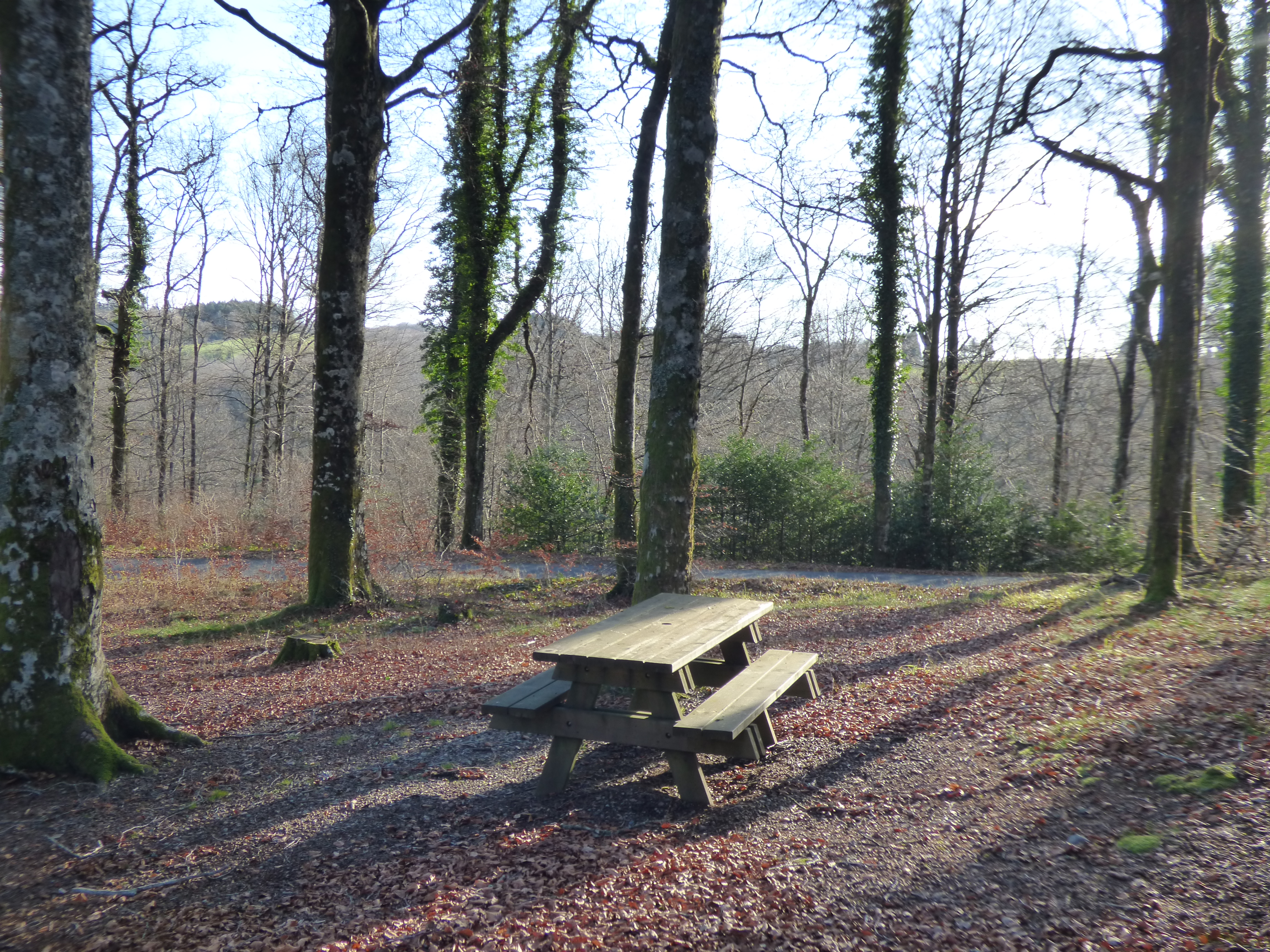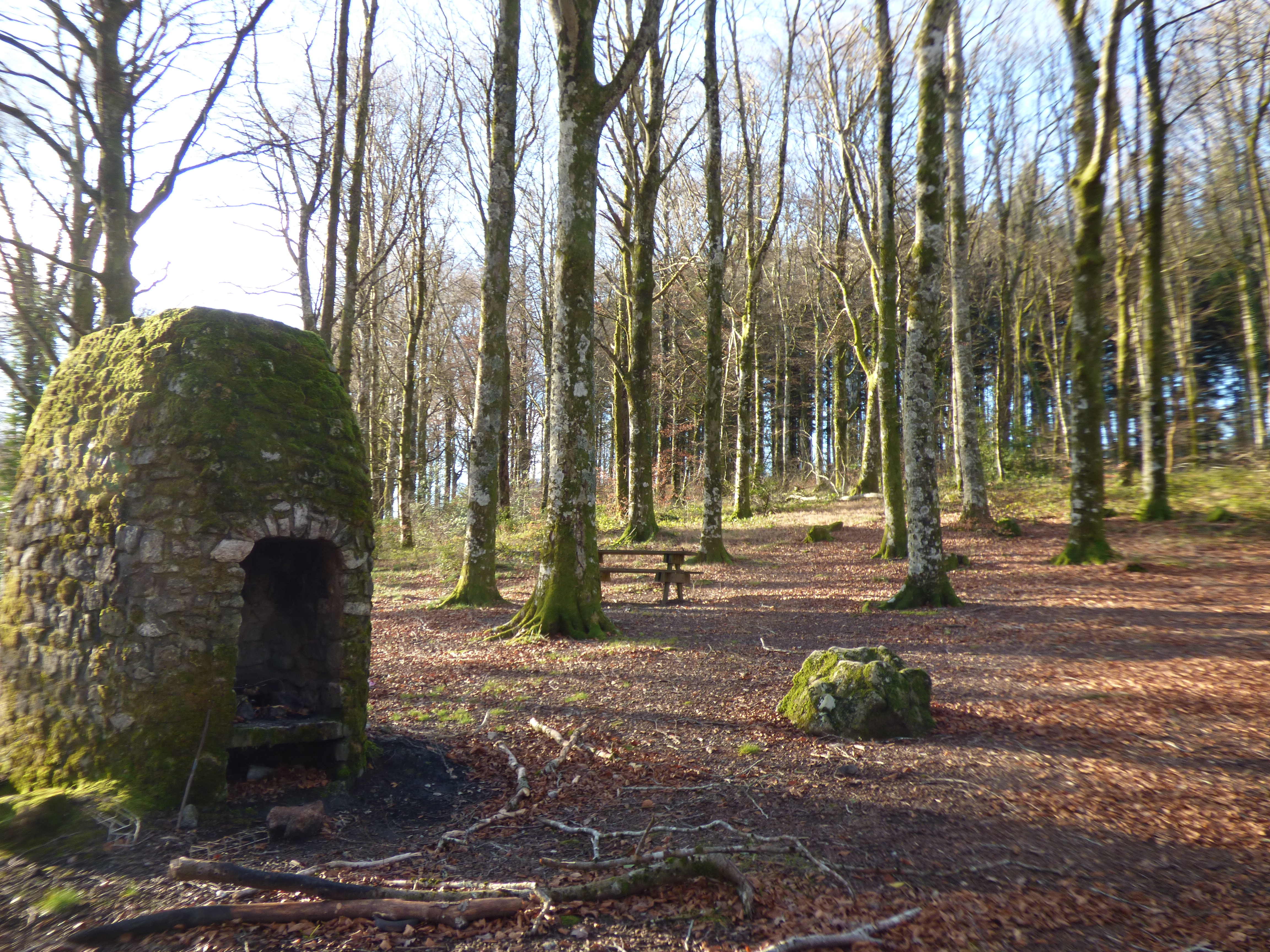 Pequeña área sombreada en el bosque equipada con una barbacoa de doble hoguera. Aparcamiento cercano.
