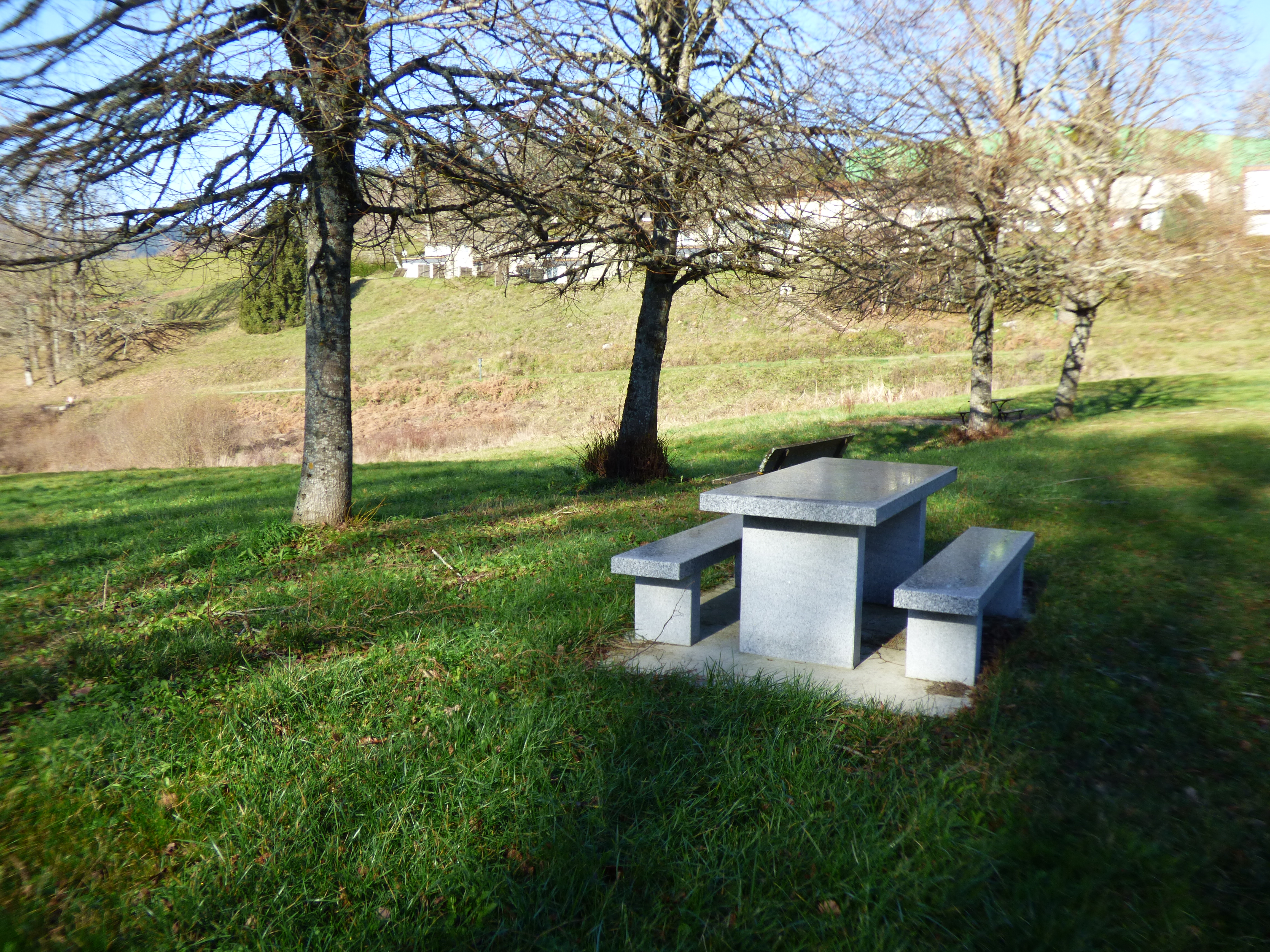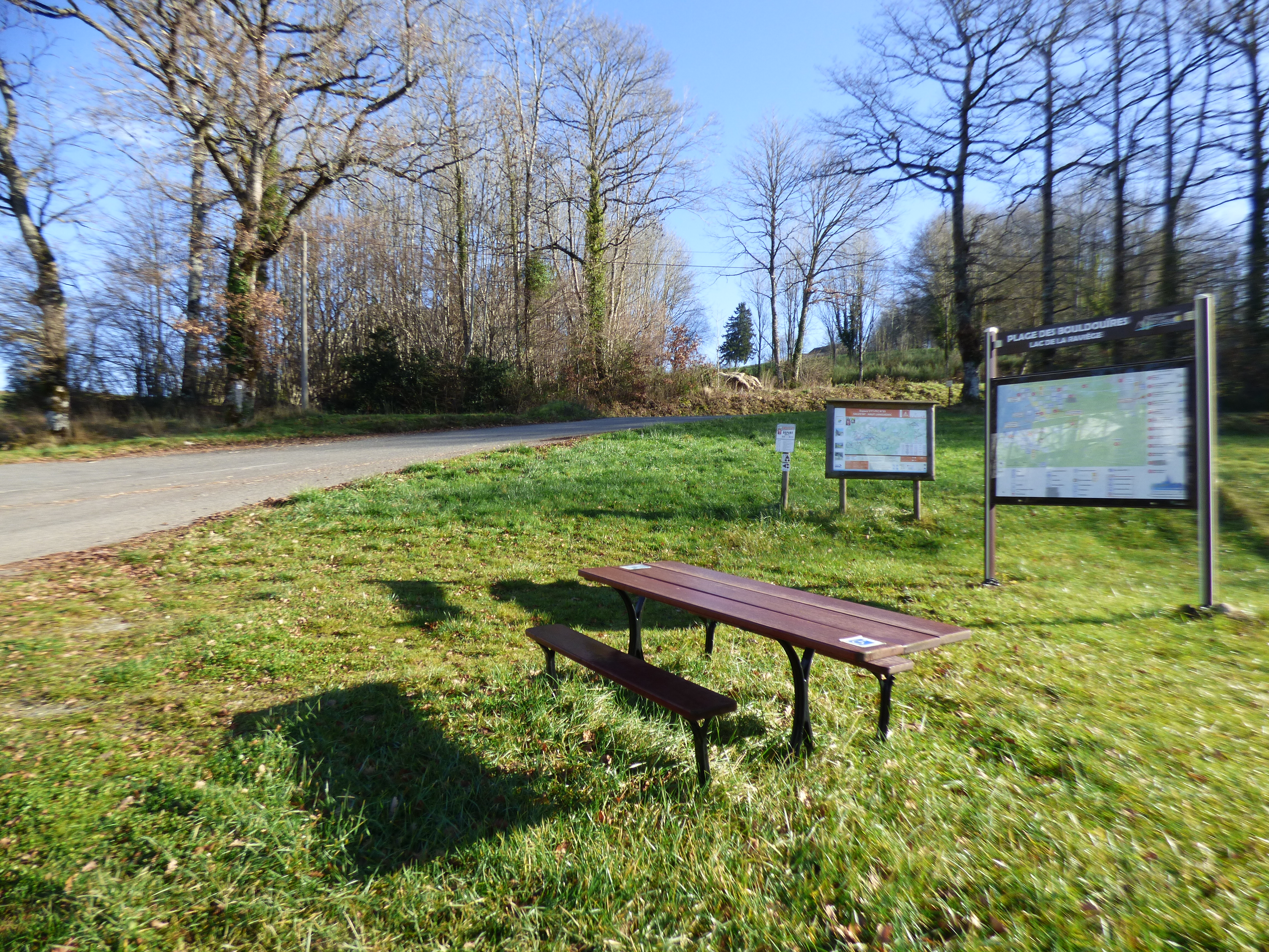 Cerca de la base de ocio de Bouldouïres. Área con tres mesas, una de ellas accesible para personas con movilidad reducida.