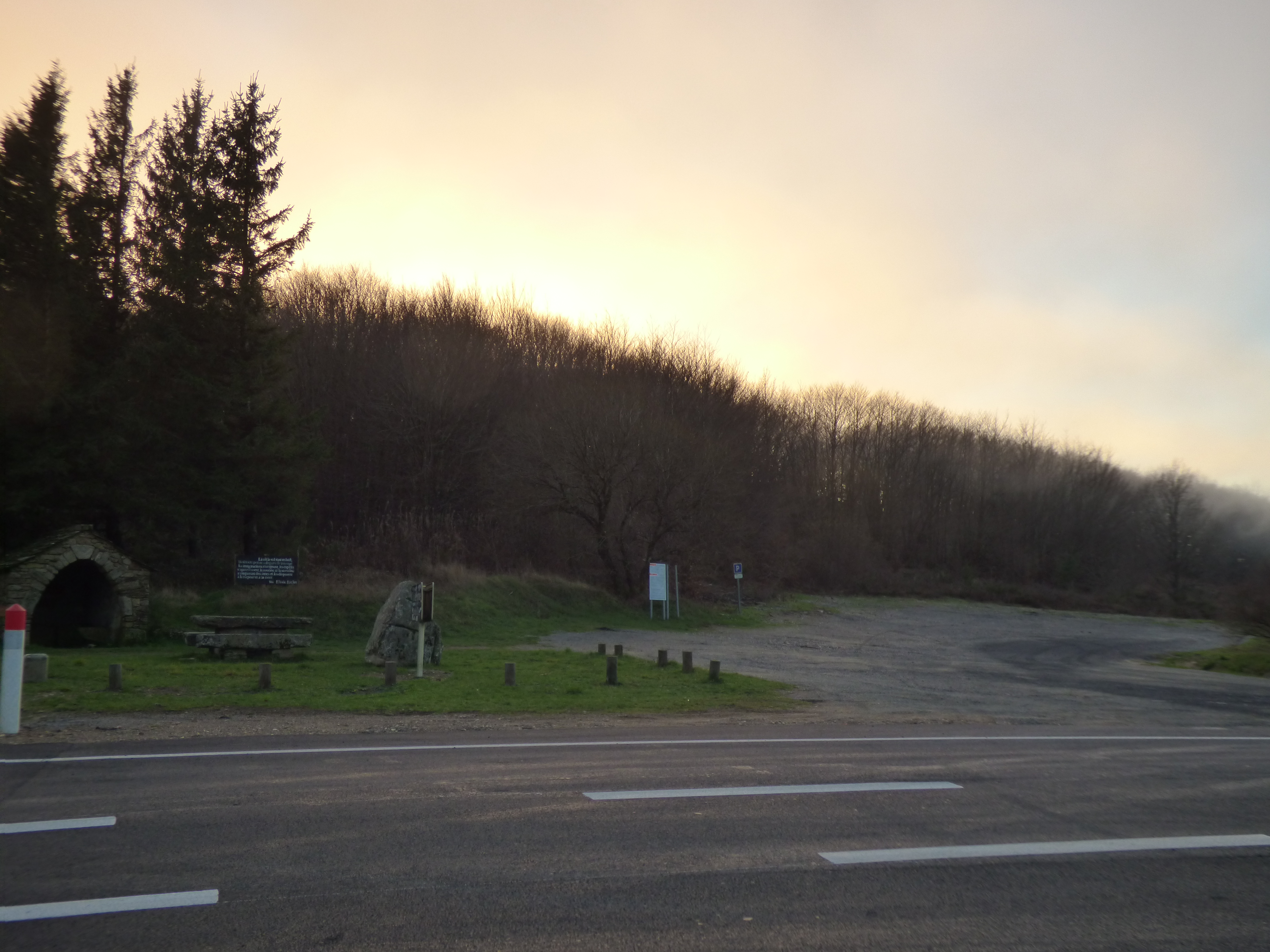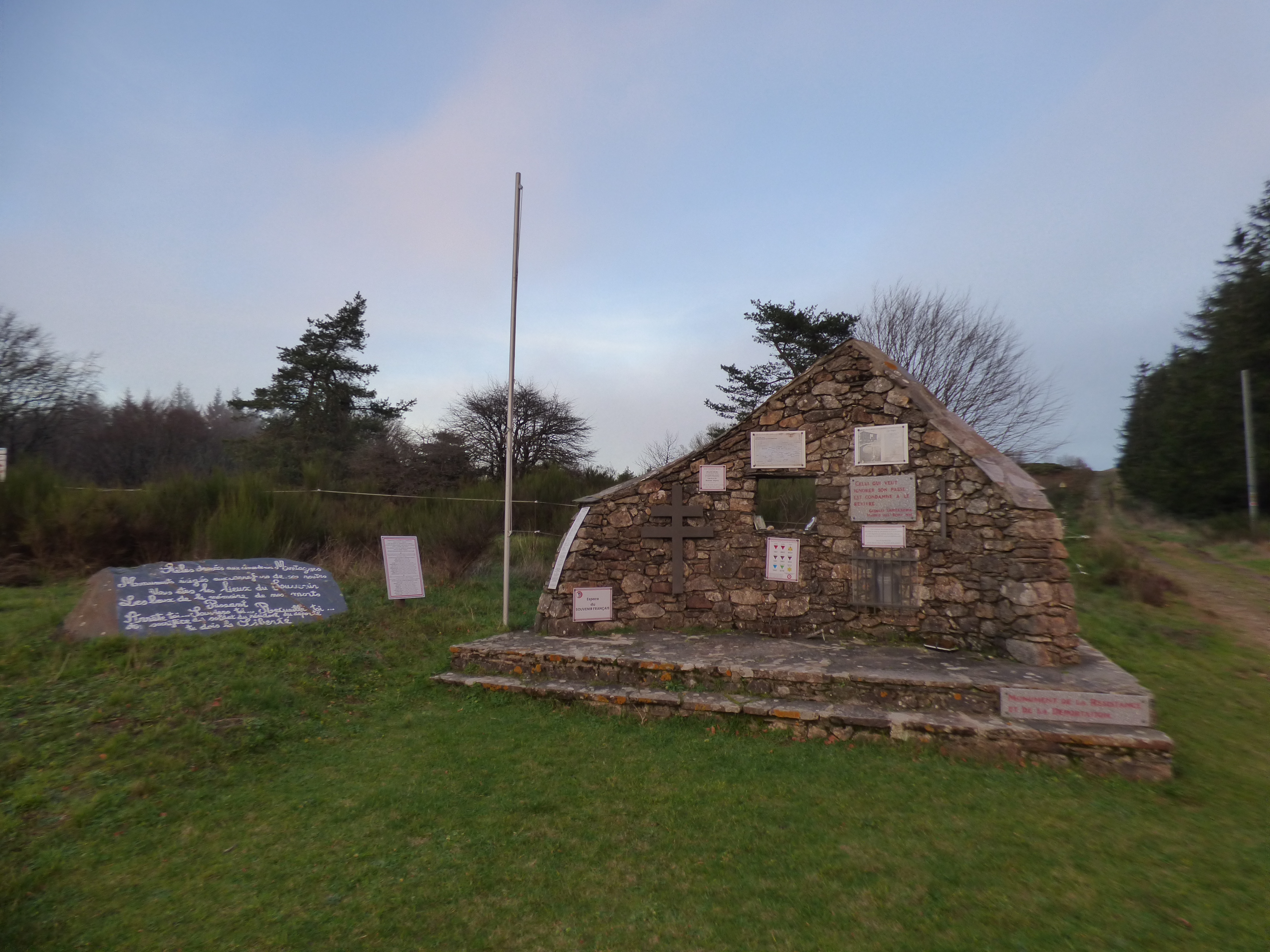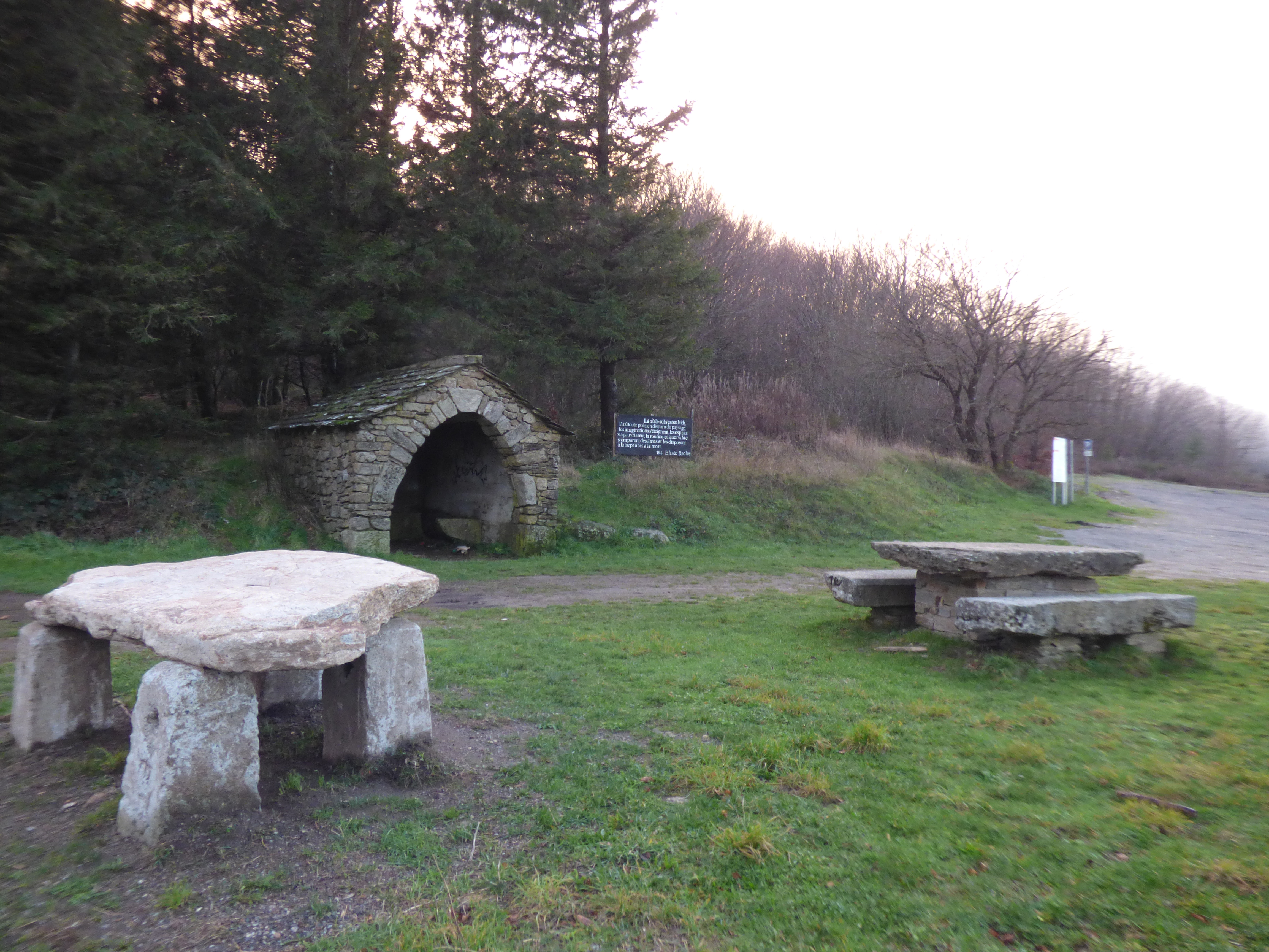 Área equipada con mesas de piedra y un gran aparcamiento. Refugio y estela conmemorativa cercanos.