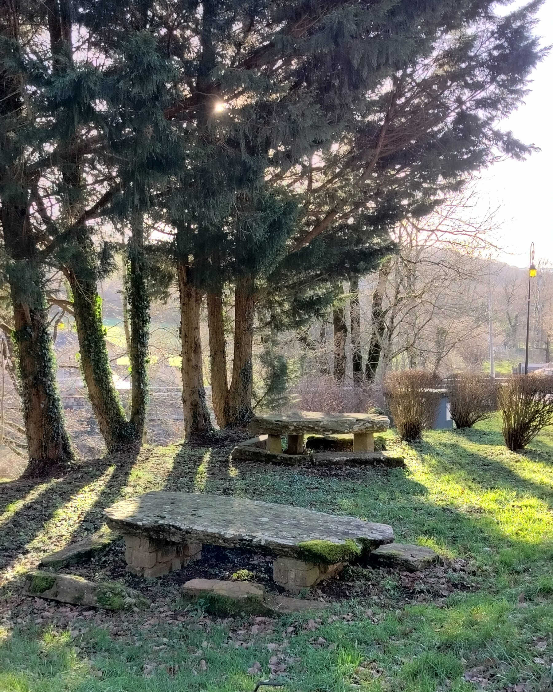 Pequeña área junto a la carretera equipada con dos mesas de piedra.