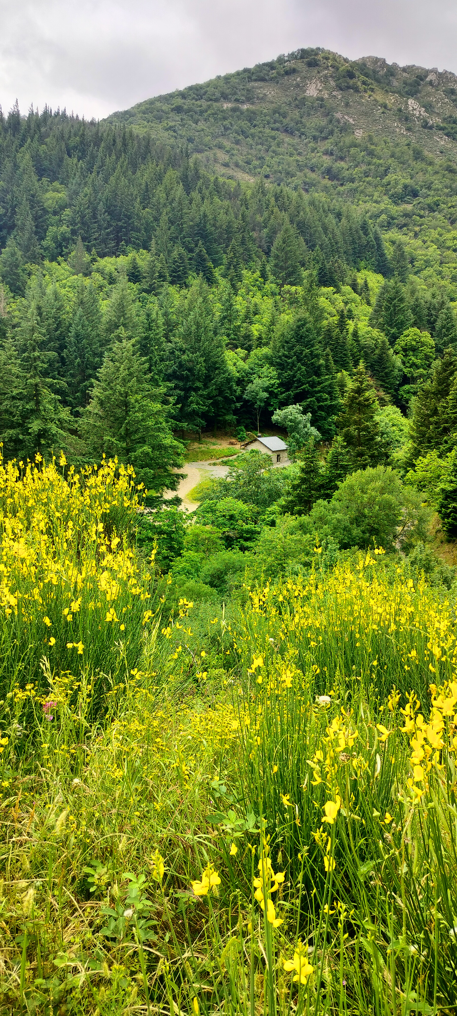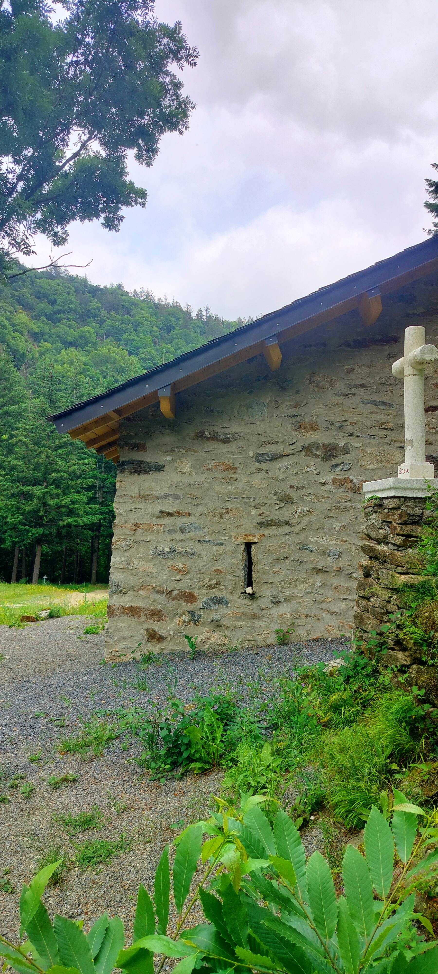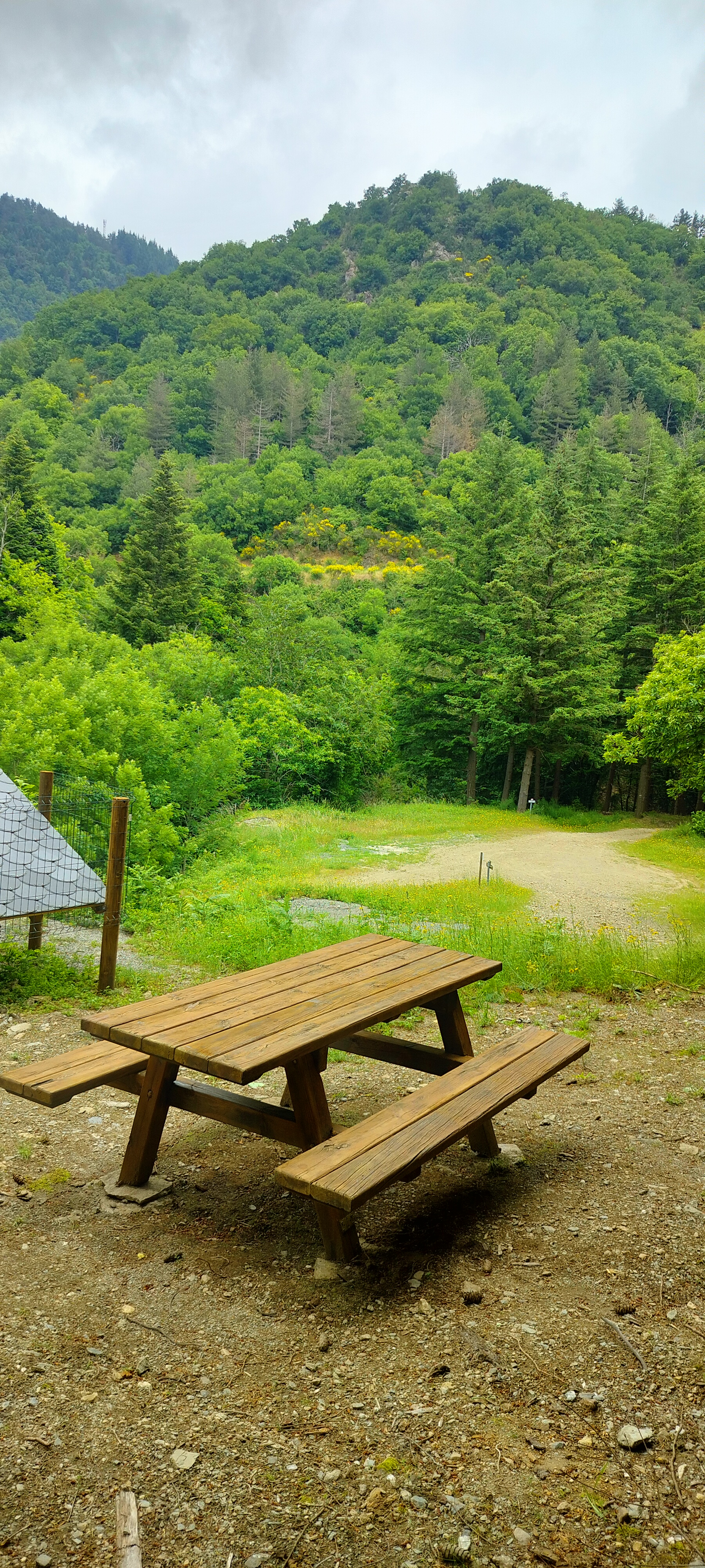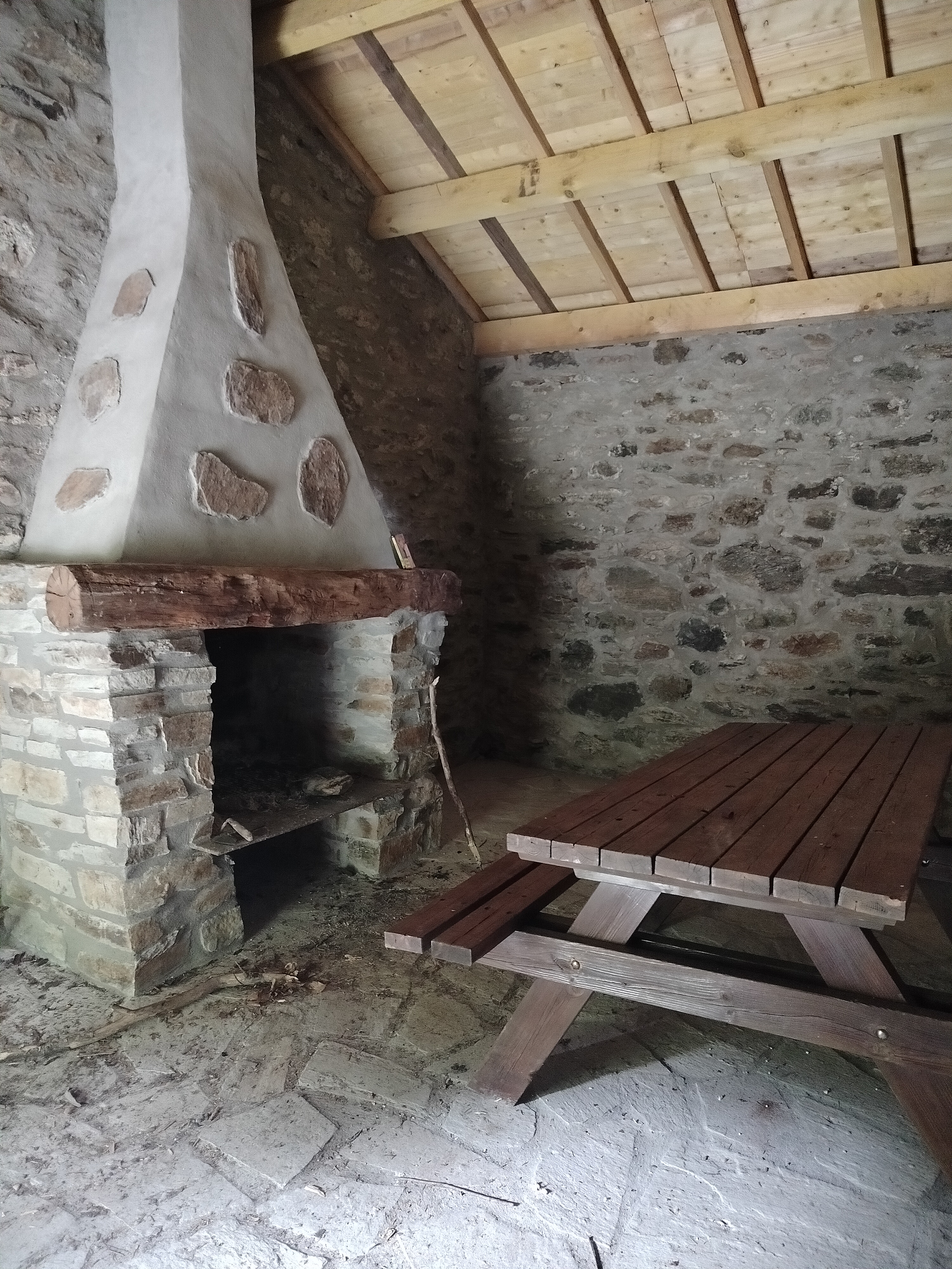 Parada en el sendero GR653 antes de la subida a Murat-sur-Vèbre. Área cubierta en un antiguo aprisco con chimenea y una mesa exterior.