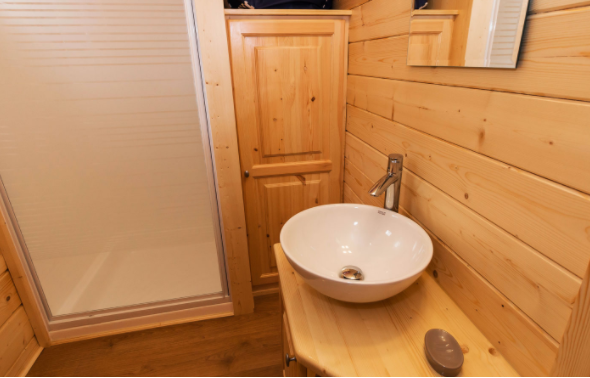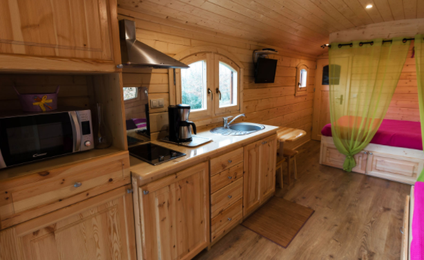 Una caravana encantadora con todas las comodidades: zona de dormitorio, cocina, baño interior con ducha y WC.