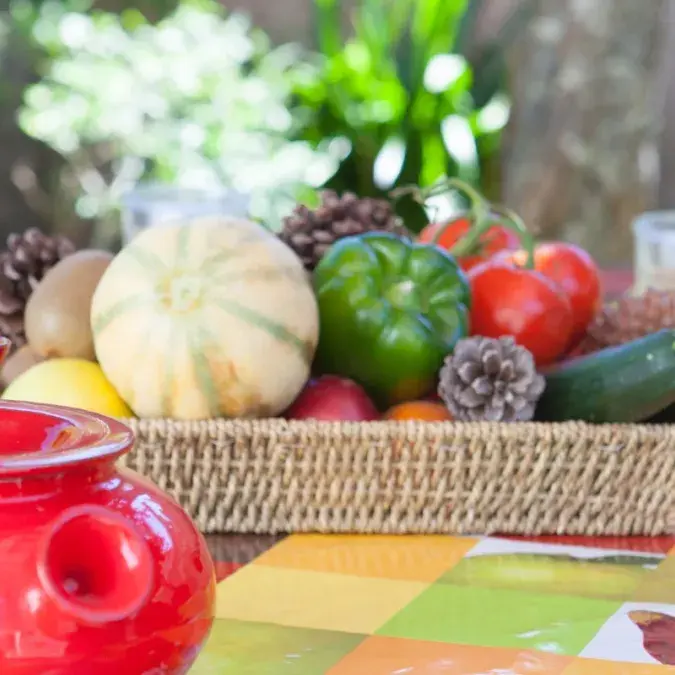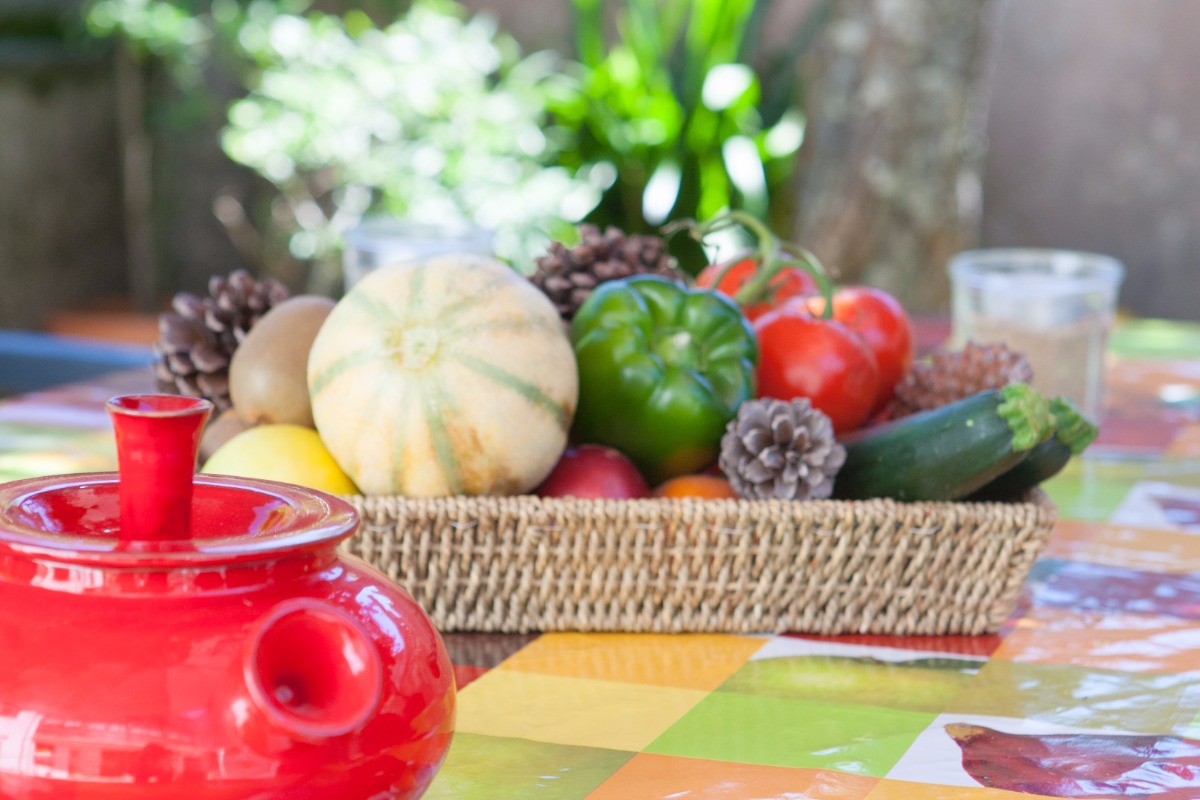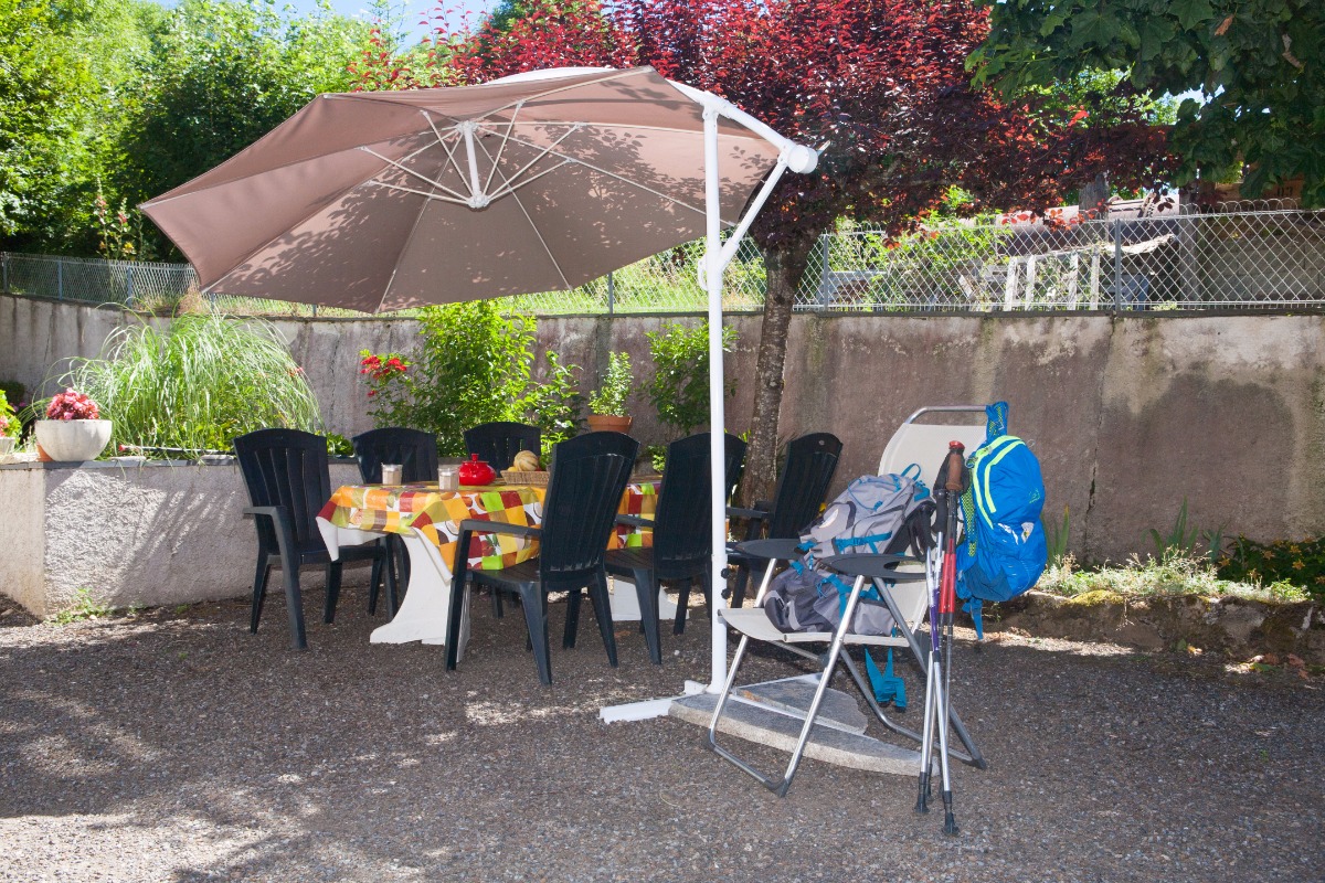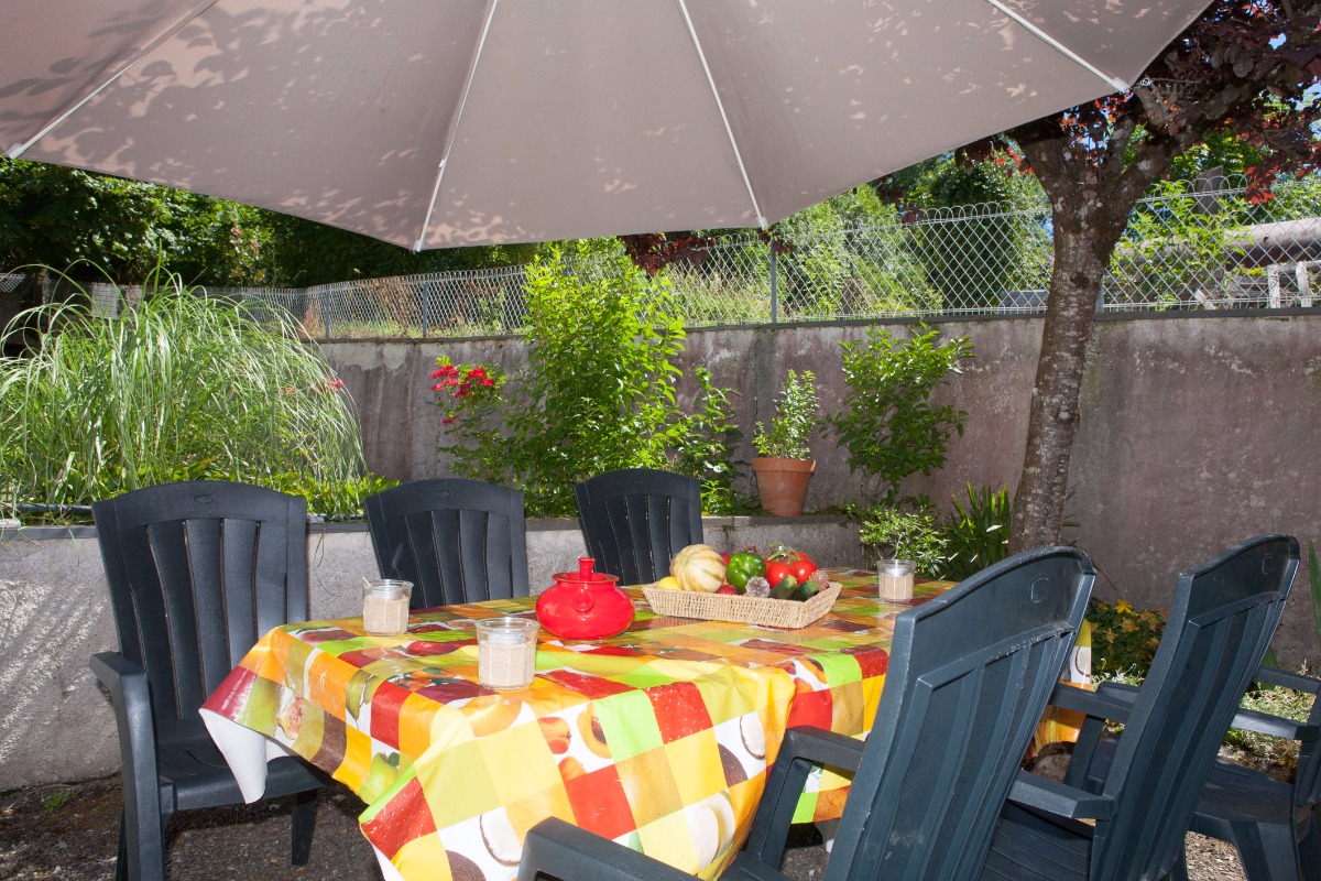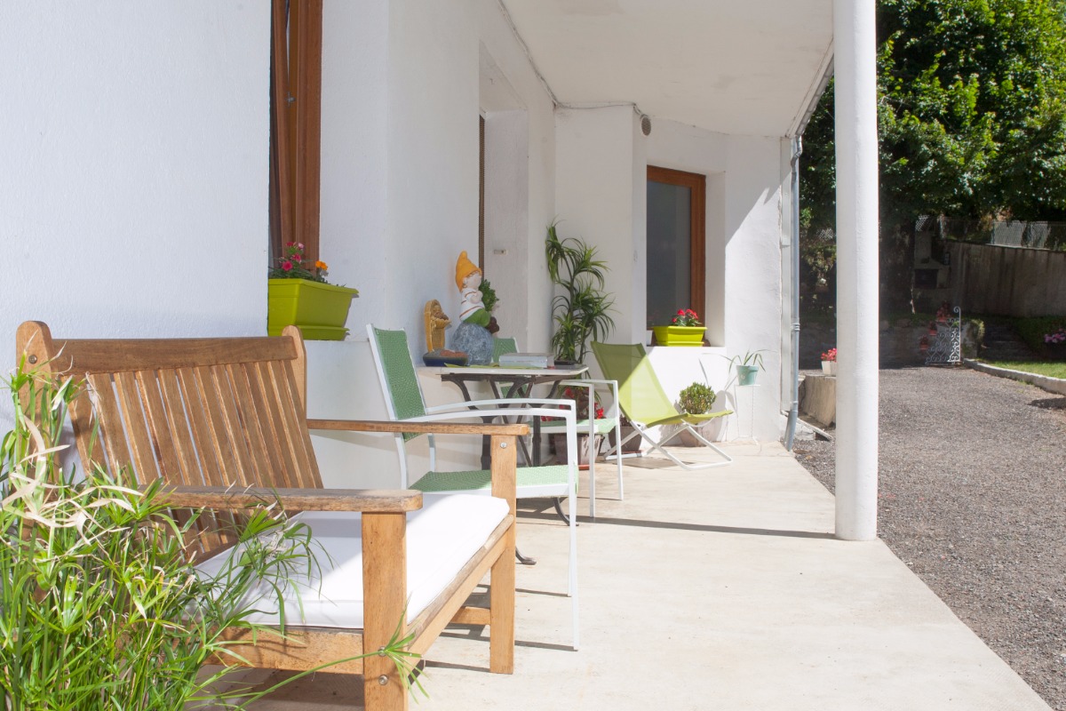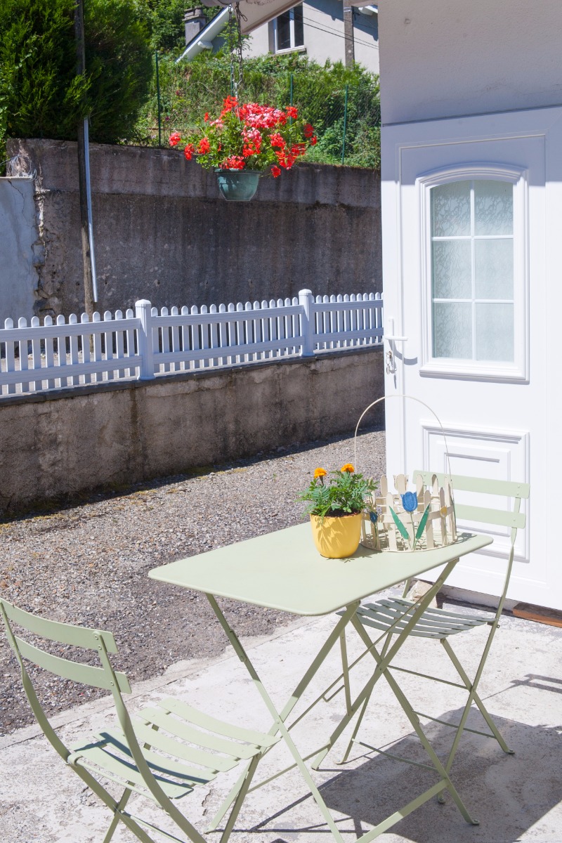 Extérieur clos : terrasse, cour, espace vert, salon de jardin.