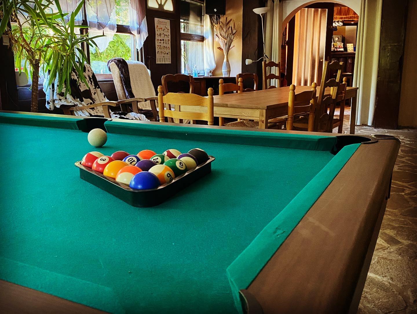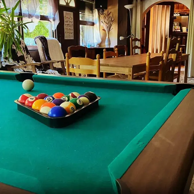 En commun: grande salle accueillante et chaleureuse où sont servis les repas du soir en table commune ainsi que les petits déjeuners. Ses bars (l'un à l'intérieur et un d'été en extérieur), son écran géant pour des soirées ,visionnage de vos matchs de sports préférés, ses activités: billard, ping-pong, baby foot, pétanque, jeux de société...