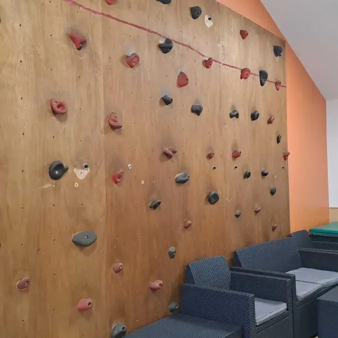 Entre le bâtiment Montalet et Montgrand, se trouve La Jasse équipée d'une cuisine professionnelle pouvant accueillir des groupes de 12 à 30 personnes en complément des possibilités d'accueil existants. Mur d'escalade sur un pan de mur et tapis de sol. Sanitaires également disponibles dans ce bâtiment.