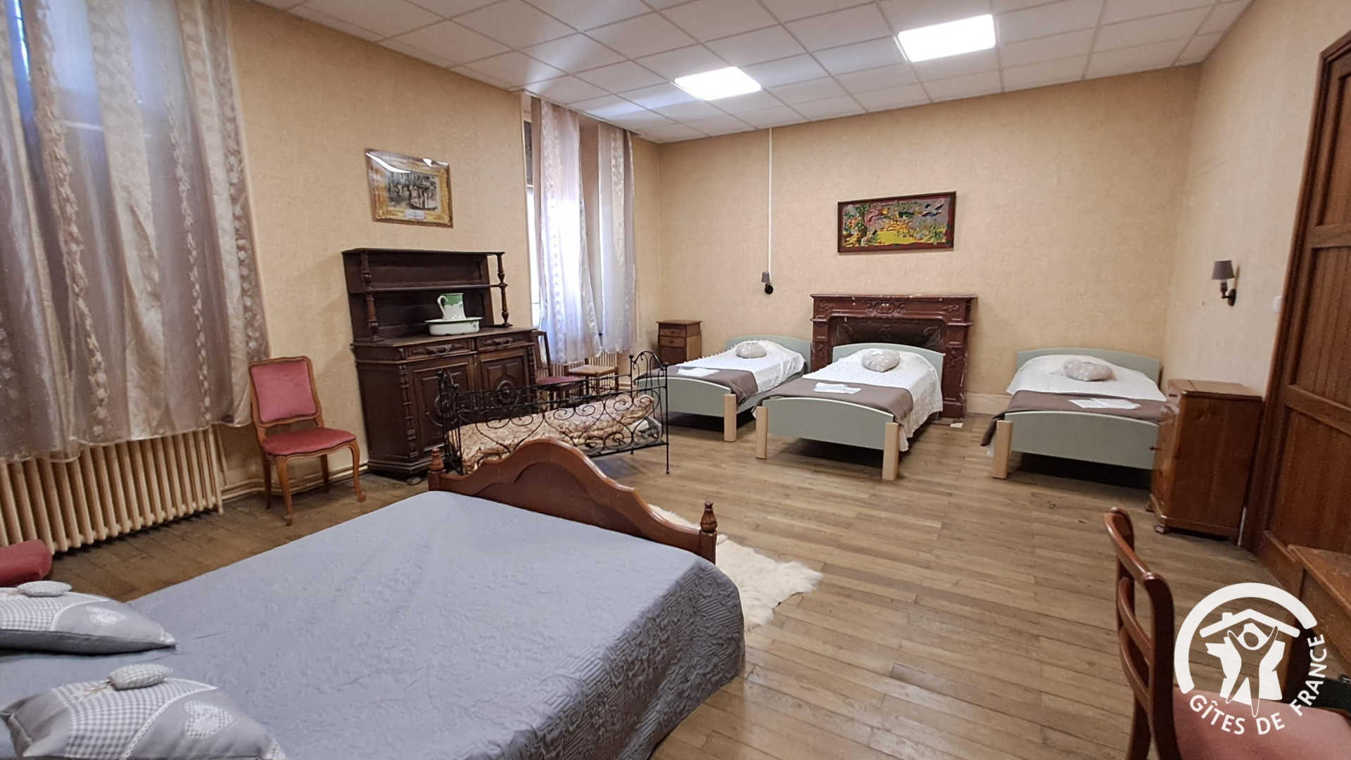 Le château compte 18 chambres réparties au 1er et 2e étage (sans ascenseur). Les chambres accueillent de 2 à 5 personnes avec des lits simples en 90x190cm et des lits doubles en 140x190cm. Sanitaires collectifs. Une chambre avec sanitaires privatifs. Possibilité de petit-déjeuner, repas, location de draps...