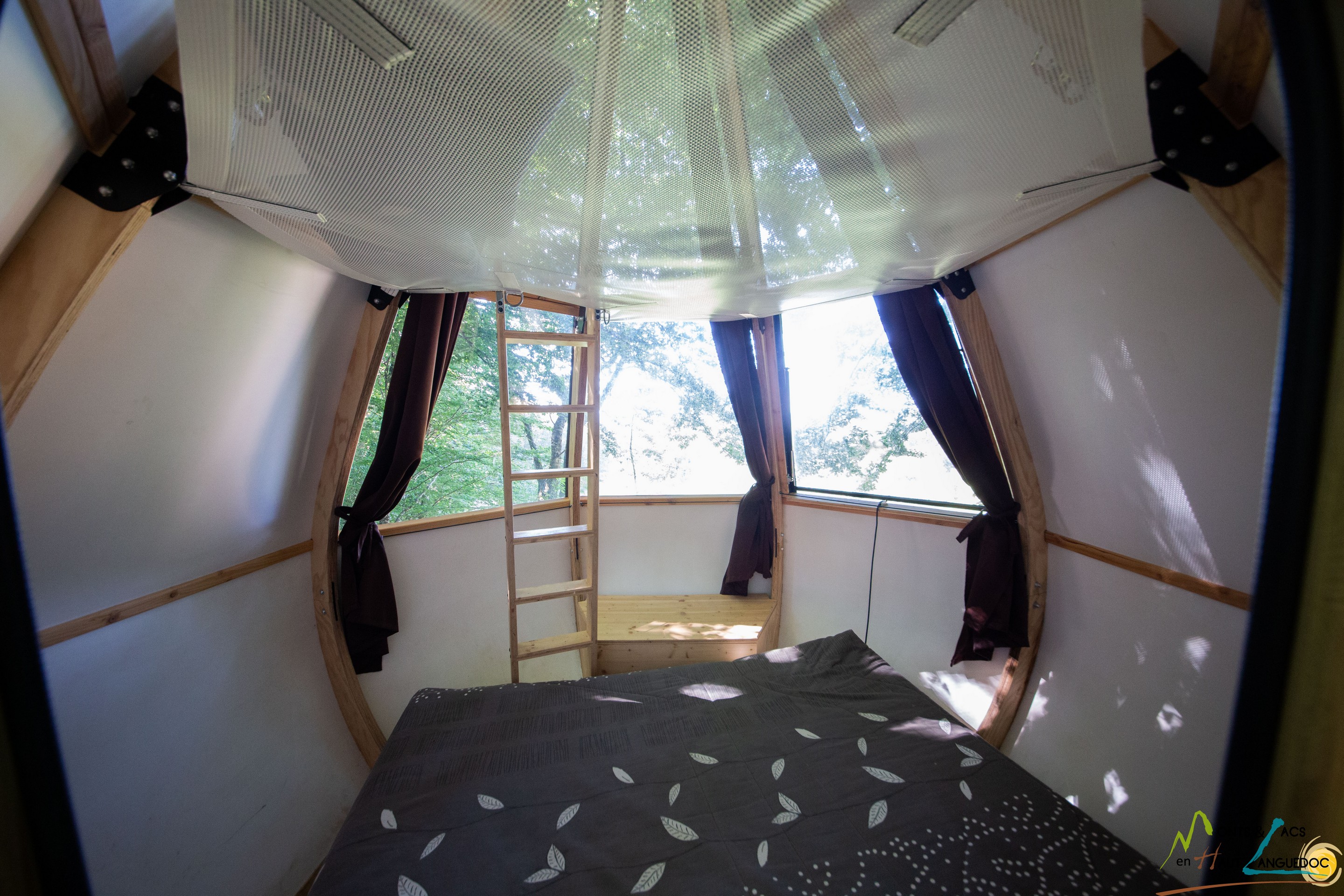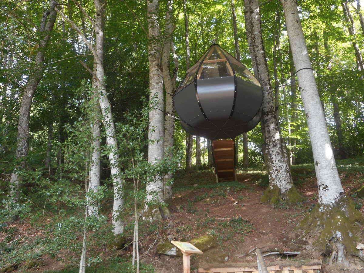 Suspendu à trois beaux hêtres, hébergement insolite semi vitré permettant une vue plongeante sur la forêt et un éclairage au clair de lune.
