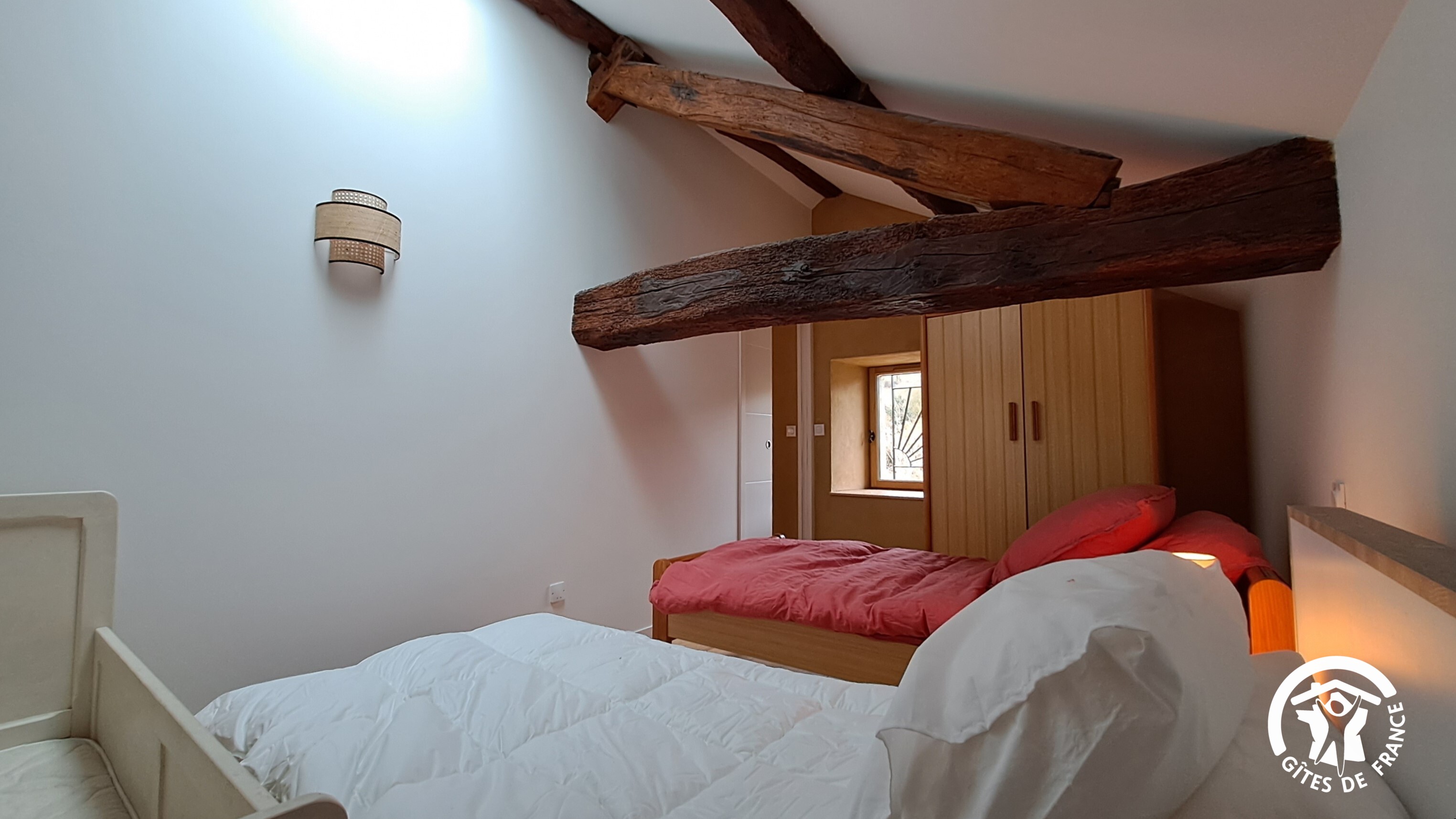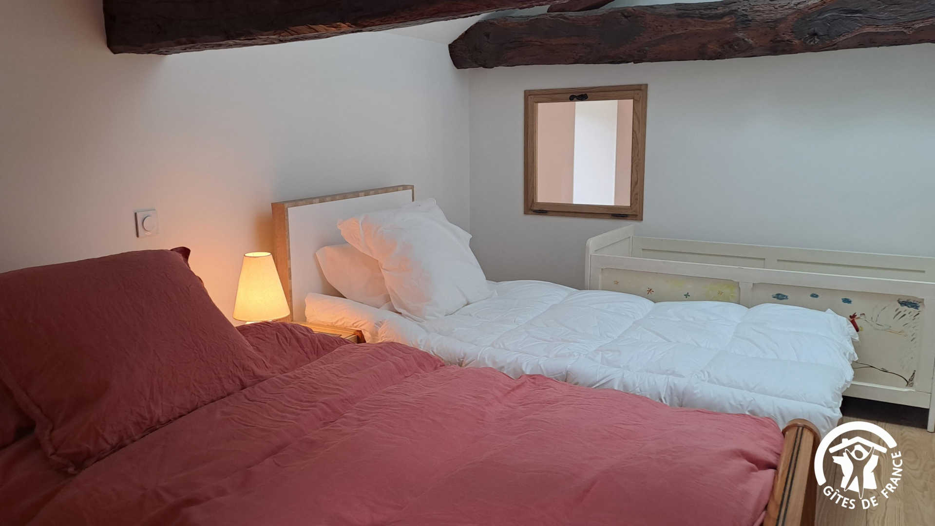 - Chambre à l'étage : deux lits simples en 90x190cm avec draps en lin naturel et lit bébé.