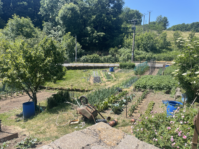 Terrasse privative d'environ 20m² avec salon de jardin et barbecue. Jardinet attenant avec légumes à disposition.