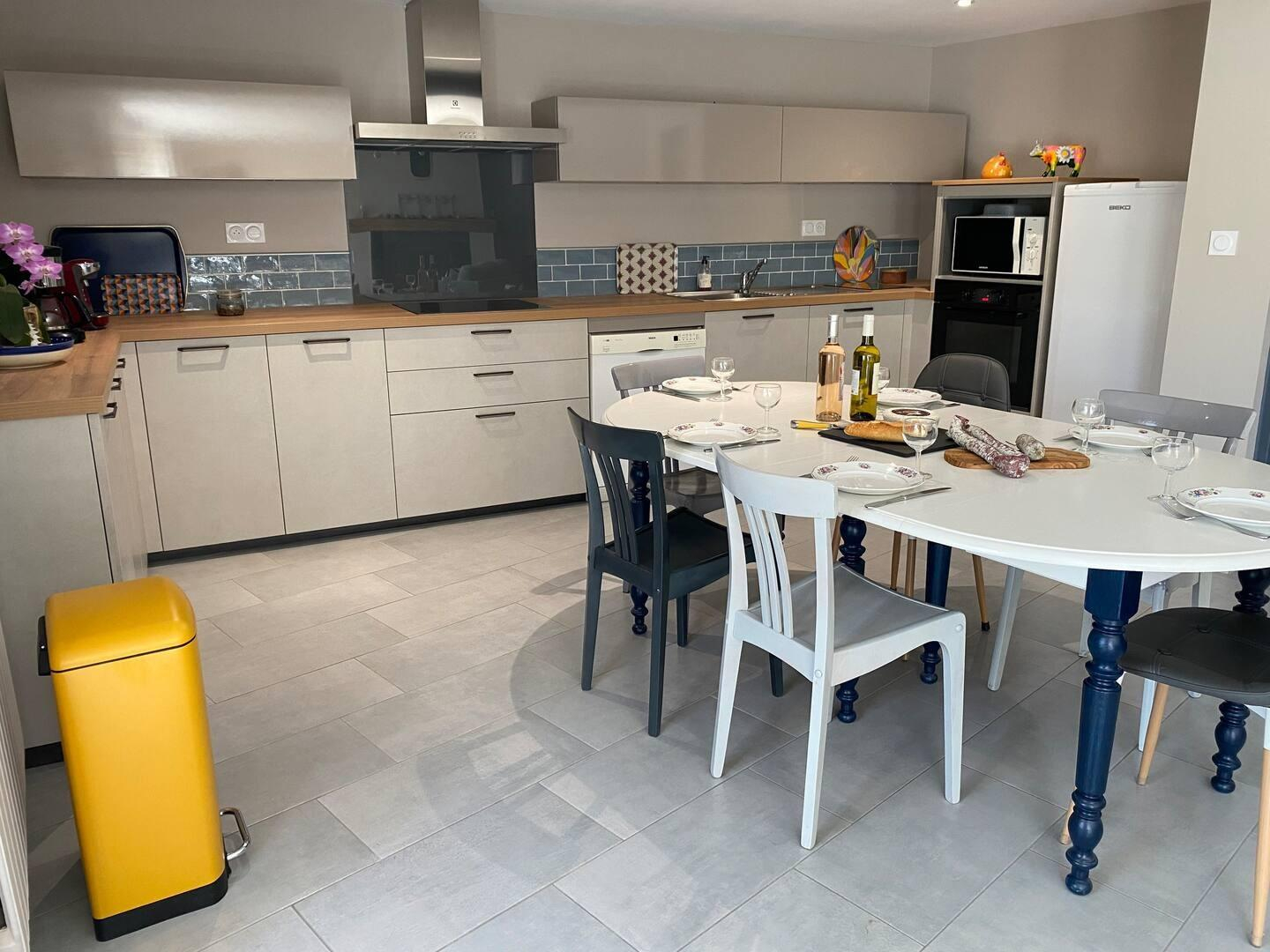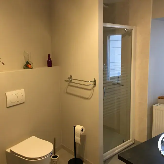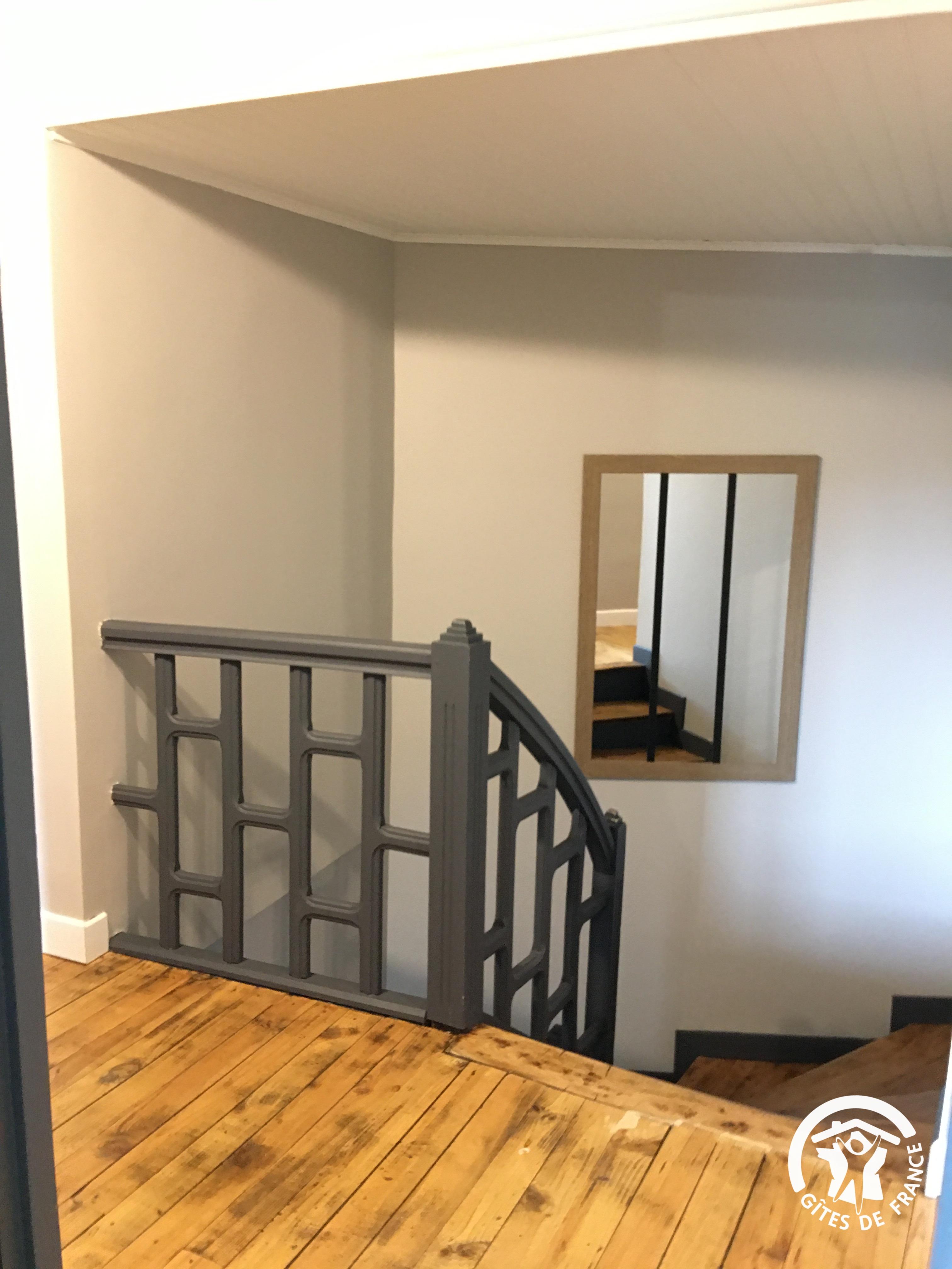La maison mitoyenne à celle des propriétaire a été récemment rénovée pour offrir des espaces cosy et lumineux. Le logement se trouve en étage. Les escaliers extérieurs à côté du parking vous mènent directement dans l'espace salle à manger- cuisine. Bien agencée, celle-ci se dispose d'un réfrigérateur avec compartiment congélateur, de cafetières à filtre et nespresso, de mixer, robot de cuisine, autocuiseur, appareil à raclette, grille-pain, bouilloire... Le coin salon s'agence autour de la cheminée – insert. Sur ce palier, se trouve la première salle d'eau avec toilettes.