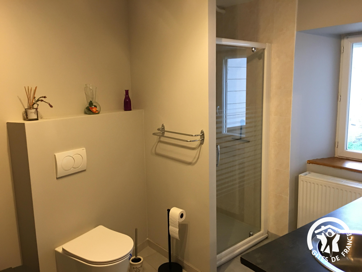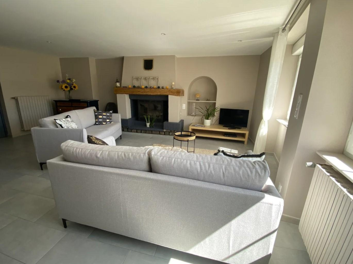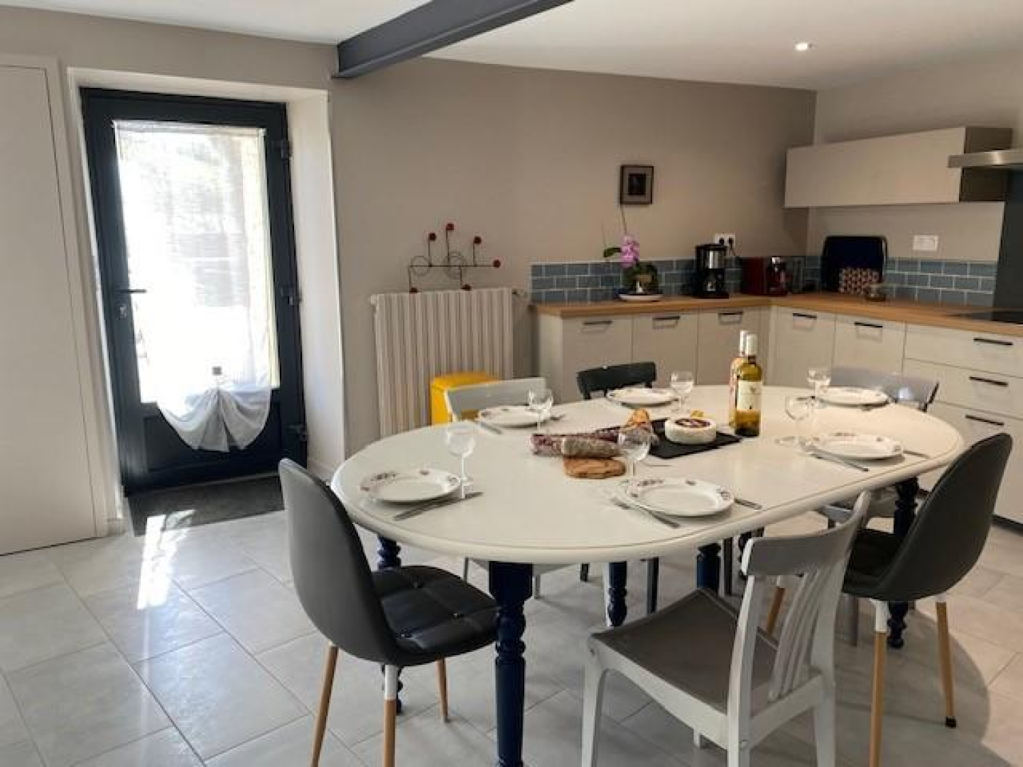 La maison mitoyenne à celle des propriétaire a été récemment rénovée pour offrir des espaces cosy et lumineux. Le logement se trouve en étage. Les escaliers extérieurs à côté du parking vous mènent directement dans l'espace salle à manger- cuisine. Bien agencée, celle-ci se dispose d'un réfrigérateur avec compartiment congélateur, de cafetières à filtre et nespresso, de mixer, robot de cuisine, autocuiseur, appareil à raclette, grille-pain, bouilloire... Le coin salon s'agence autour de la cheminée – insert. Sur ce palier, se trouve la première salle d'eau avec toilettes.